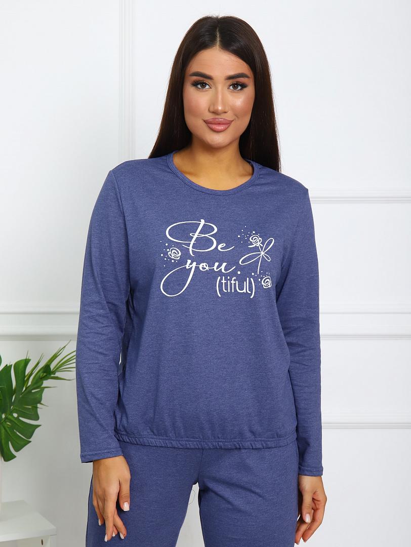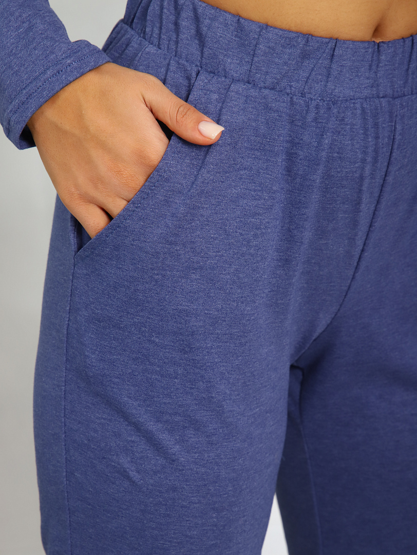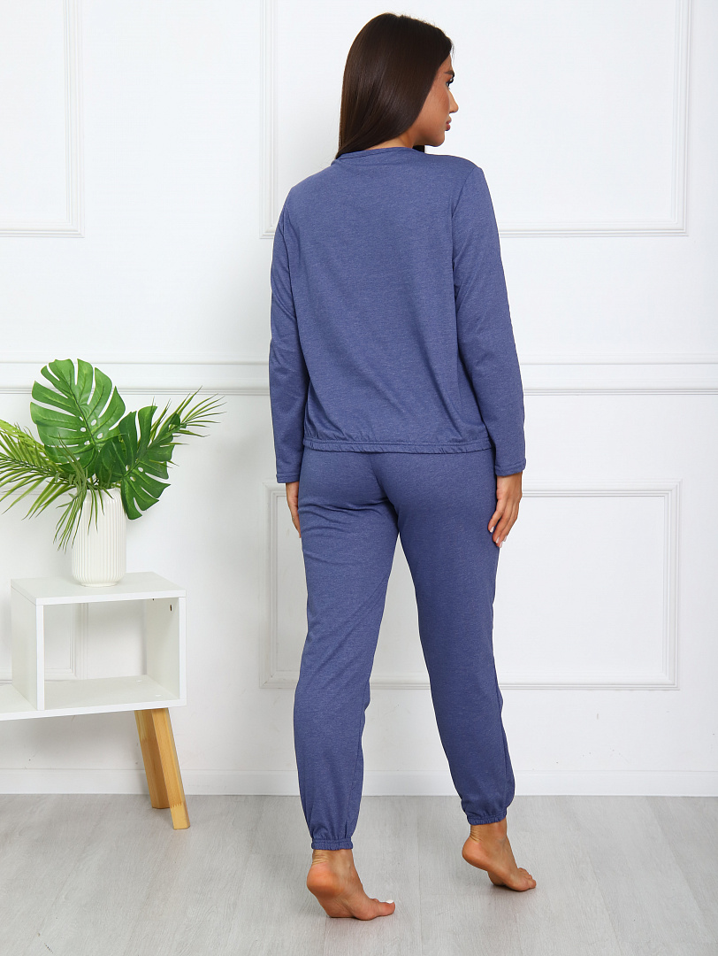 Костюм женский выполнен из меланжированной кулирки. Кофта с длинным рукавом снизу на резинки, горловина окантована, на полочке выполнена печать.  Брюки свободного силуэта, по бокам карманы, низ брюк на резинке.