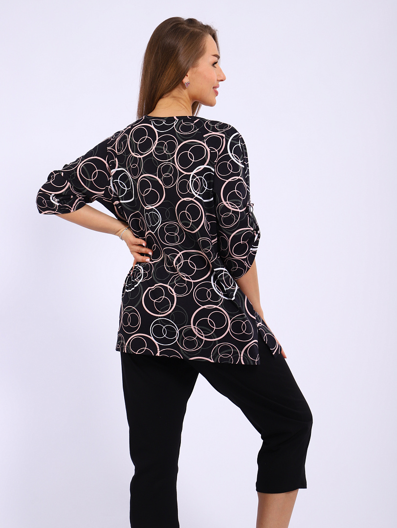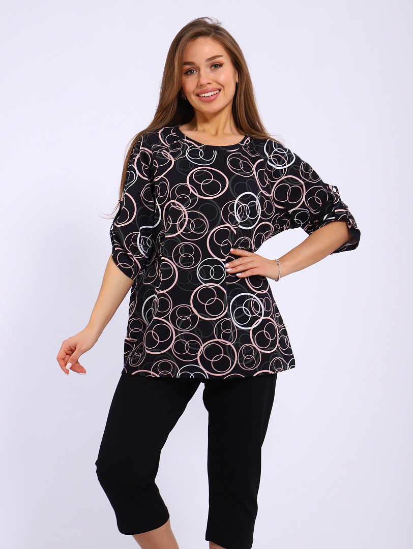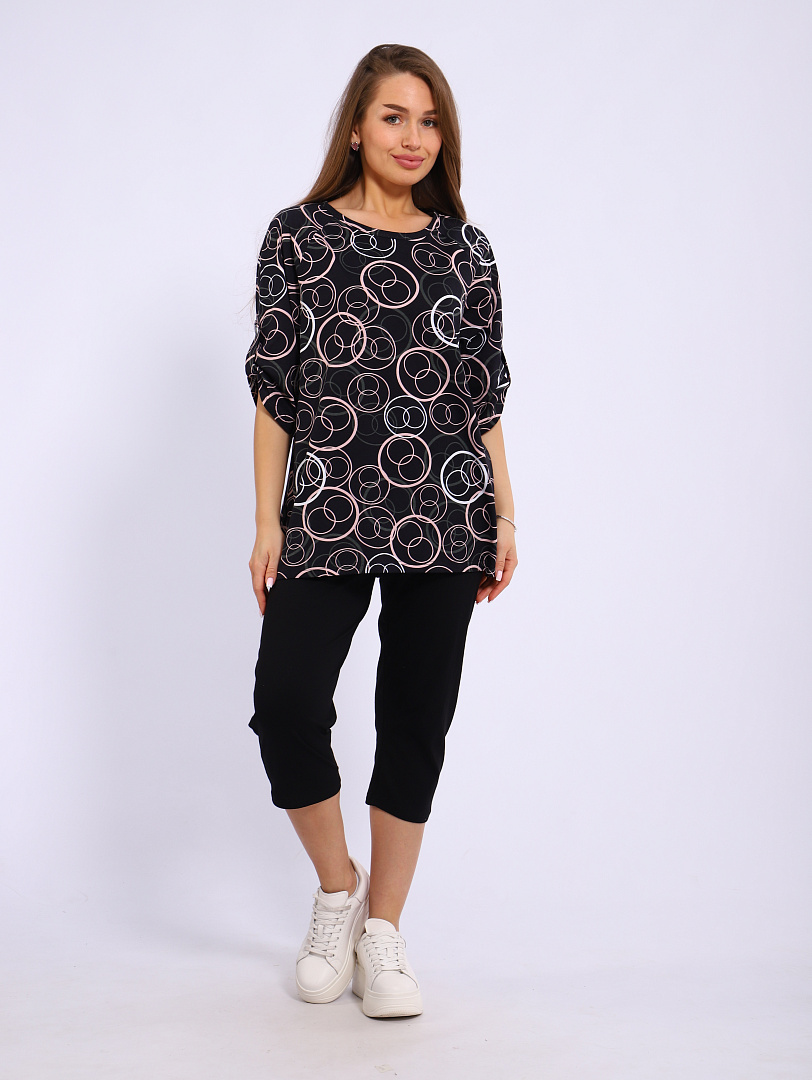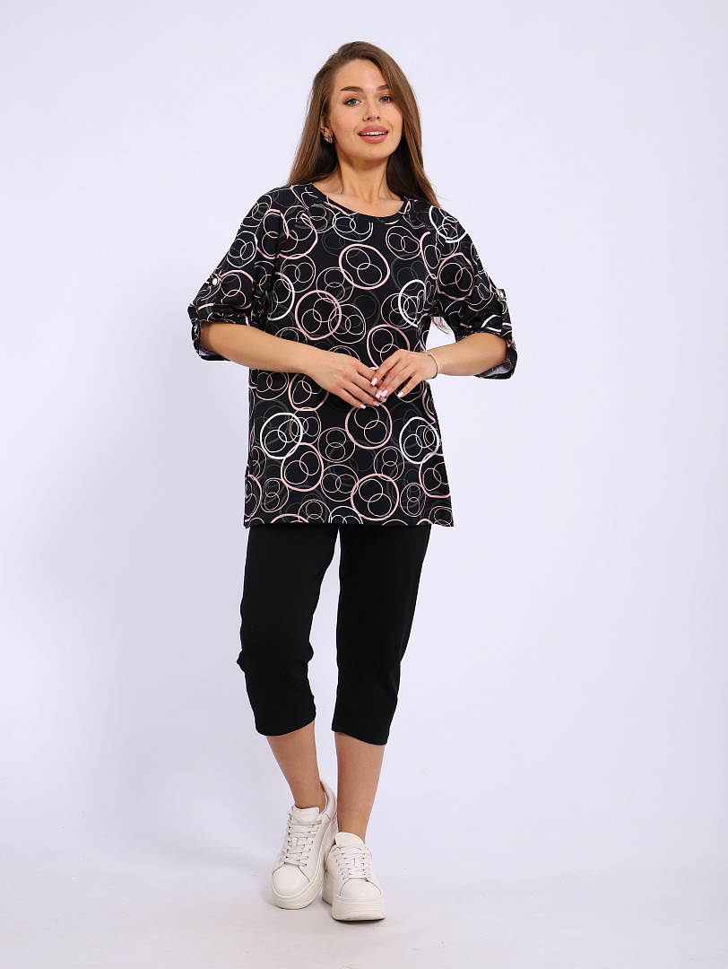 Костюм с бриджами женский, выполнен из трикотажного полотна кулирка. Костюм состоит из блузы и бридж. Блуза свободного силуэта, рукав 3/4,  по бокам блузы имеются разрезы. Бриджи на резинке.