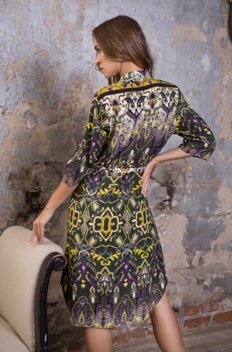 Туника женская Миа-Миа выполненная из принтованной яркой вискозы. Модель на поясе свободного силуэта средней длины. Туника рубашечного типа с воротником стойкой и планкой застежкой на пуговицах. Рукав прямой длиной до локтя. В боковых швах изделия карманы.