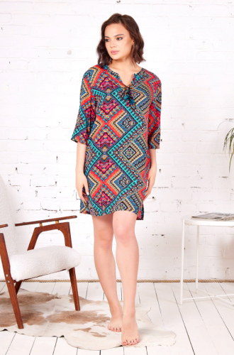Платье домашнее женское Миа-Миа выполнено из яркой принтованной вискозы. Модель приталенного силуэта на поясе длиной выше колена. Платье с круглым вырезом горловины и рюшами по высоте полочки.