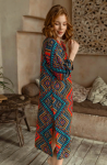 Длинная туника прямого силуэта с круглым вырезом горловины на полочке и спинке из принтованной вискозы. Модель с втачными широкими рукавами. Круглый вырез горловины полочки и спинки обработан притачной фигурной обтачкой. V-образный разрез на горловине полочки обработан притачной планкой. Планка туники застегивается на петли и обтяжные пуговицы из основной ткани.