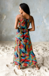 Длинное платье прямого силуэта из яркой принтованной вискозы на поясе-шурке. Высота лифа регулируется с помощью шнура по горловине. Разрез по боковому шву. 100% вискоза