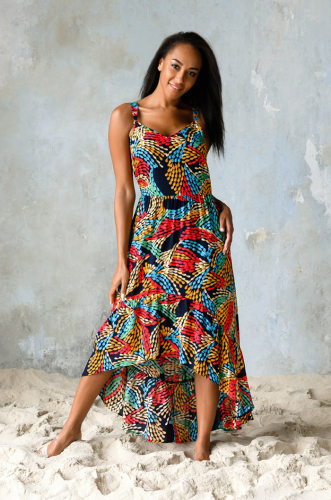 Платье выполнено из яркой принтованной вискозы. Модель приталенного силуэта с поясом по талии. Платье на широких регулируемых бретельках, по подолу рюша. Модель имеет удлиненный подол сзади. 100% вискоза