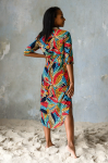 Туника выполнена из яркой принтованной вискозы. Модель на поясе прямого силуэта длины миди. Туника рубашечного типа с воротником стойкой и планкой застежкой на пуговицах. Рукав прямой длиной 3/4. 100% вискоза