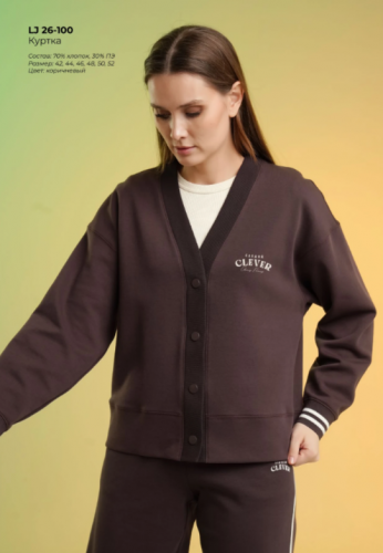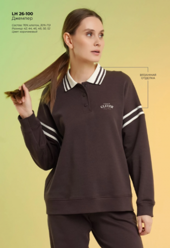 "Описание: Джемпер из трикотажного полотна дабл фейс. Длинный рукав со спущенной линией плеча. По горловине вязаный воротник с планкой на кнопки. По окату рукава вязаная отделка. По низу рукава манжет из кашкорсе,по низу изделия из основного полотна. Спереди принт.