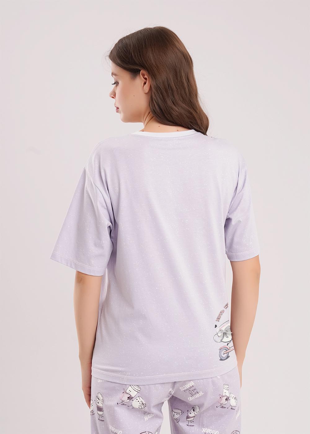 "Описание: Набор одежды из трикотажного полотна.Футболка прямого кроя.Короткий спущенный рукав.Горловина с обтачкой и планкой на пуговицы.Спереди и сзади принт,нашивка бант.По низу рукава и изделия застилы.Брюки с поясом на резинке.Боковые карманы с отрезным бочком