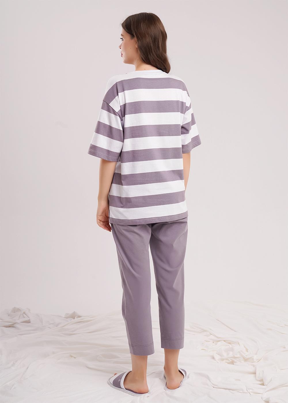 "Описание: Набор одежды из трикотажного полотна.Футболка прямого кроя. Короткий спущенный рукав,нашивка.Округлая горловина с обтачкой.Спереди накладной карман,принт,нашивка бант.Боковые разрезы.Брюки длиной 7/8 с поясом на резинке.Боковые карманы с отрезным бочком.