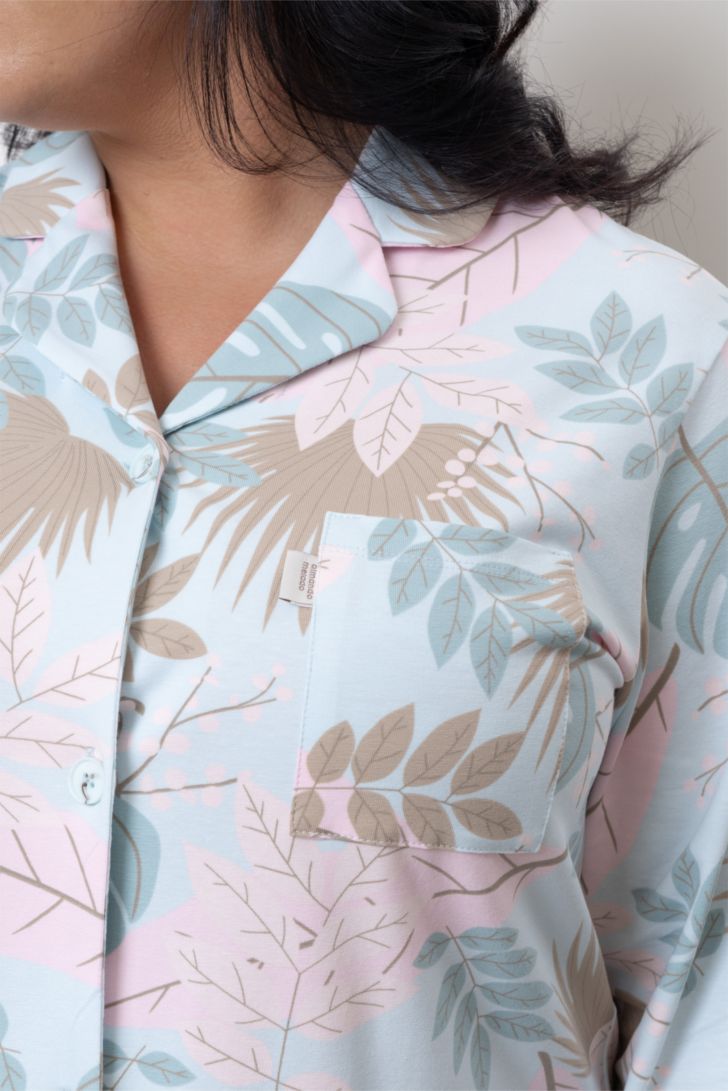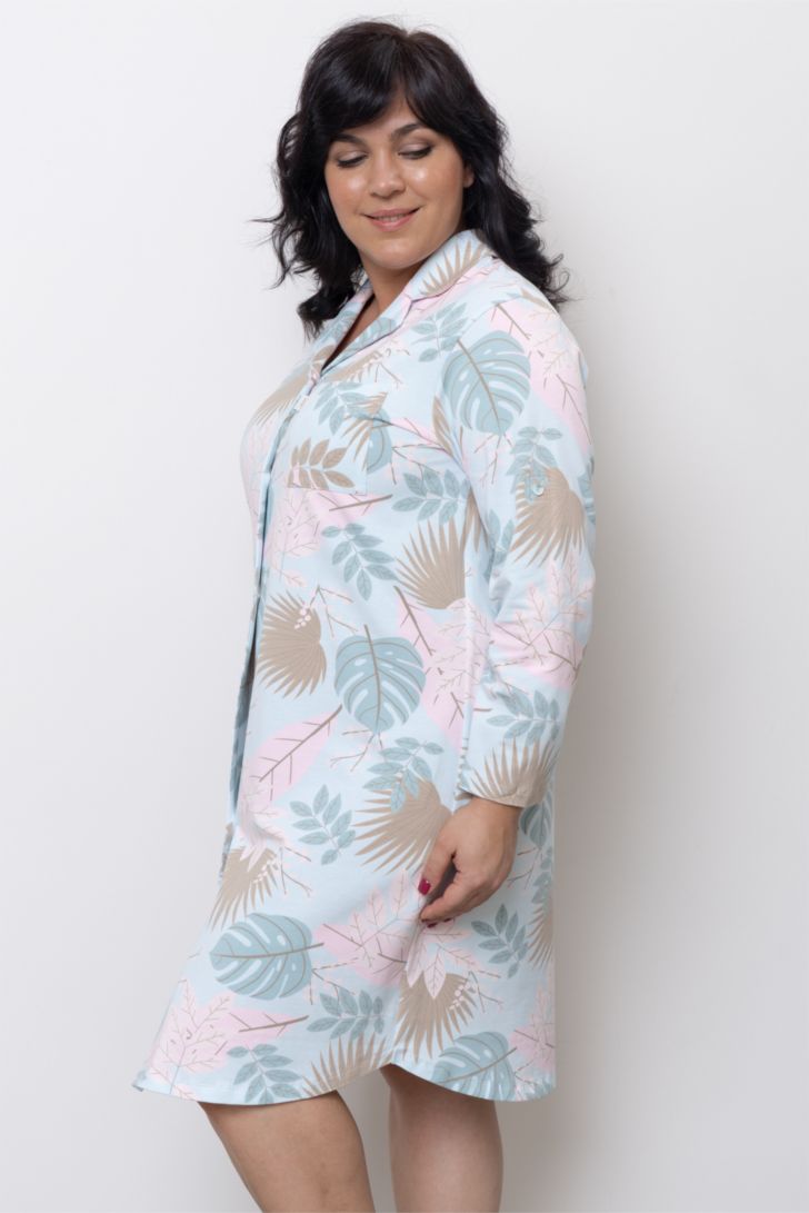 ""Халат на пуговицах классической длины с накладным карманом на груди. Рукав халата декорирован паттой на пуговице."