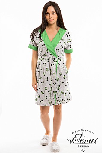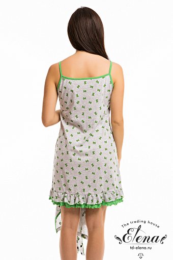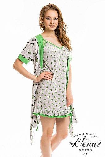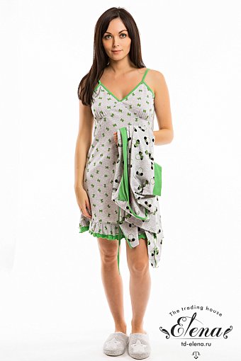 Комплект выполнен из кулирки, состоит из халата и сорочки. Халат на запах, с двумя карманами по бокам. Сорочка на тонких бретелях, с оборкой внизу.
