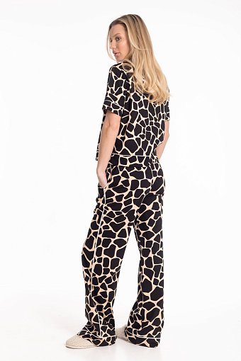 Пижама выполнена из кулирки с набивным рисунком, состоит из брюк и футболки с коротким рукавом. Футболка с коротким рукавом и круглым вырезом горловины. Пояс брюк на резинке, по бокам размещены карманы. В качестве отделки на футболке и брюках проложен кант.