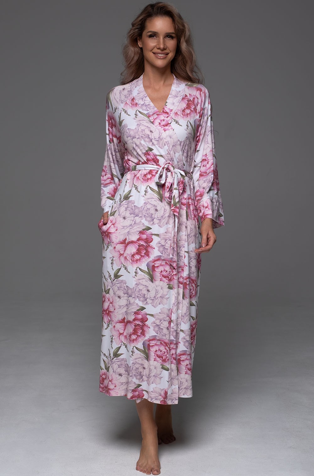 Длинный запашной халат Mia-Amore с рукавом длиной ¾. Халат выполнен из трикотажного принтованного вискозного полотна. В боковых швах обработаны карманы.