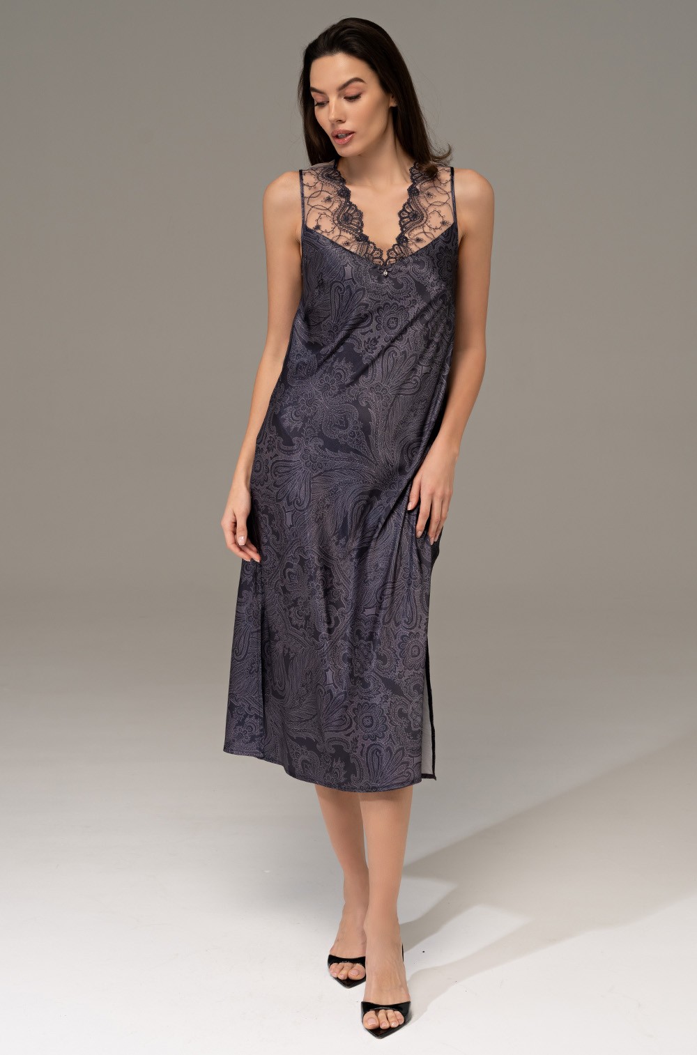 Элегантная длинная сорочка Mia-Amore полуприлегающего силуэта на широких бретелях, без подреза под грудью, выполнена из принтованного смесового шелка. Изделие дополнено ажурным кружевом по верху изделия. Декор - маленький атласный бантик с подвеской по центру выреза сорочки. По низу расположены разрезы для свободы движения.