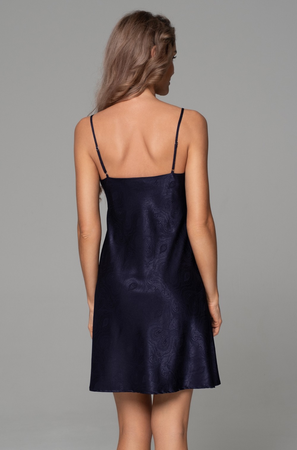 Лаконичная короткая сорочка Mia-Amore на тонких бретелях без подреза под грудью. Изделие выполнено из смесового шелкового жаккардового полотна. Декор - атласный бантик с подвеской по центру выреза.