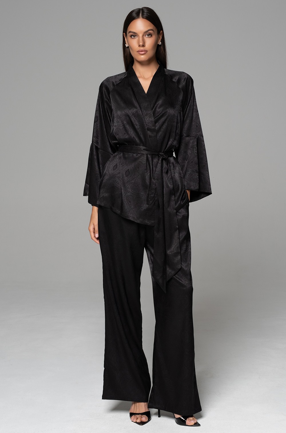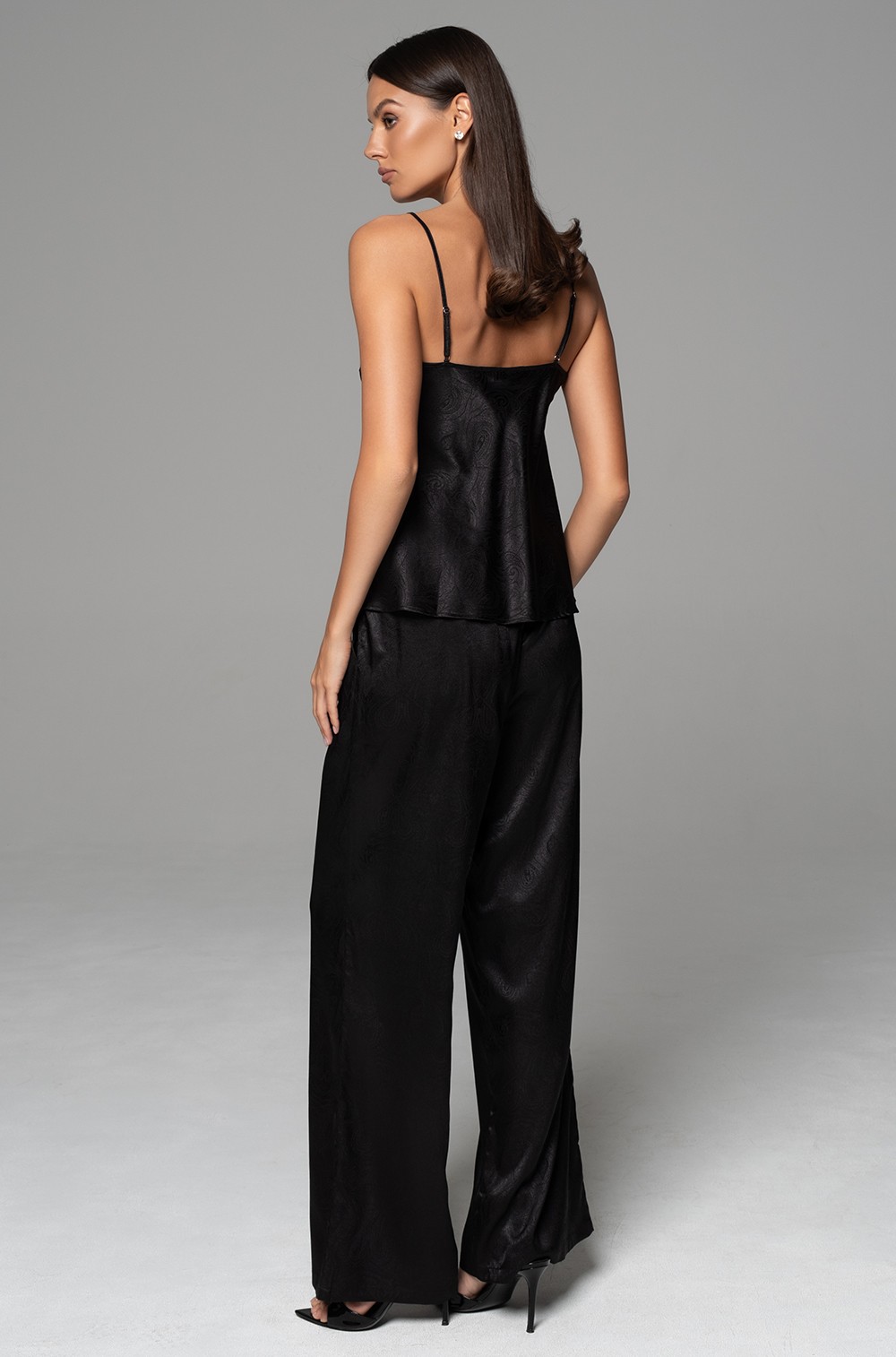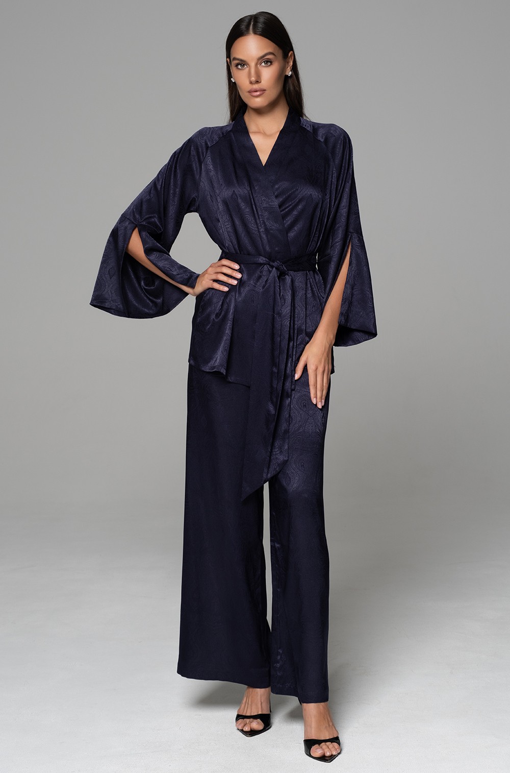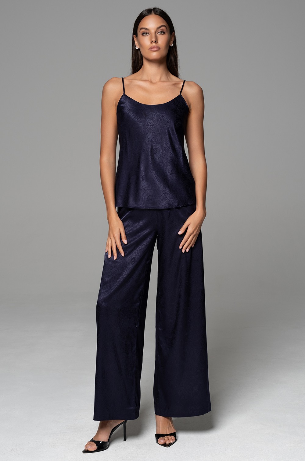 Комплект-тройка Mia-Amore состоит из топа на тонких бретелях, широких брюк и запашного жакета. Изделия комплекта выполнены из смесового шелкового жаккардового полотна. В комплекте широкий пояс.