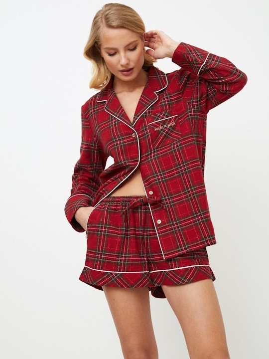 БургундскоеВино 34(XS), 36(S), 38(M), 40(L), 42(XL), 44(XXL) Представляем вашему вниманию короткую пижаму Holly, незаменимую вещь на зиму. Комплект из мягкого матового хлопка в классическую рождественскую красную клетку. Топ с длинными рукавами, застегивающийся на пуговицы, v-образным вырезом горловины и нагрудным карманом, украшенным золотой вышивкой "Загадай желание", придает модели особый шарм. В сочетании с широкими шортами с карманами вы словно окунаетесь в атмосферу комфорта. Не забудьте обратить внимание на изящную белоснежную окантовку на вырезе, манжетах рукавов и шортах. Приготовьтесь к стильному отдыху в короткой пижаме Holly, которая станет вашим идеальным выбором для холодных зимних ночей. И не забудьте, что, пока вы наслаждаетесь уютом своей короткой пижамы Holly, почему бы не подарить своей второй половинке длинную пижаму Hendrix? Это идеальный способ поделиться теплом и стилем сезона вместе. Изделие выполнено из хлопкового фланеля. 100% хлопок