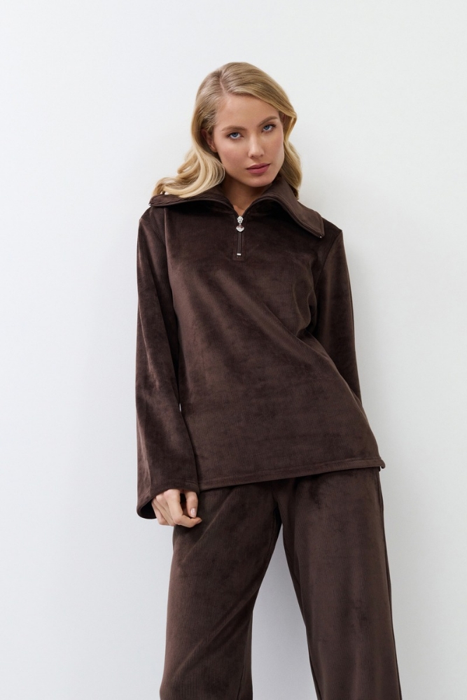 Шоколадный 36(S), 38(M), 40(L), 42(XL), 44(XXL) Комплект женский со штанами MILENE SET SOFT для максимального комфорта и расслабления, окутывает вас и подарит уют. Комплект выполнен из приятной к телу ткани в мелкий рубчик. Джемпер с воротником на молнии, по бокам разрезы. Брюки прямого кроя, с карманами, пояс на эластичной резинке. Комплект станет вашим идеальным спутником в моменты расслабления. 95% полиэстер, 5% эластан