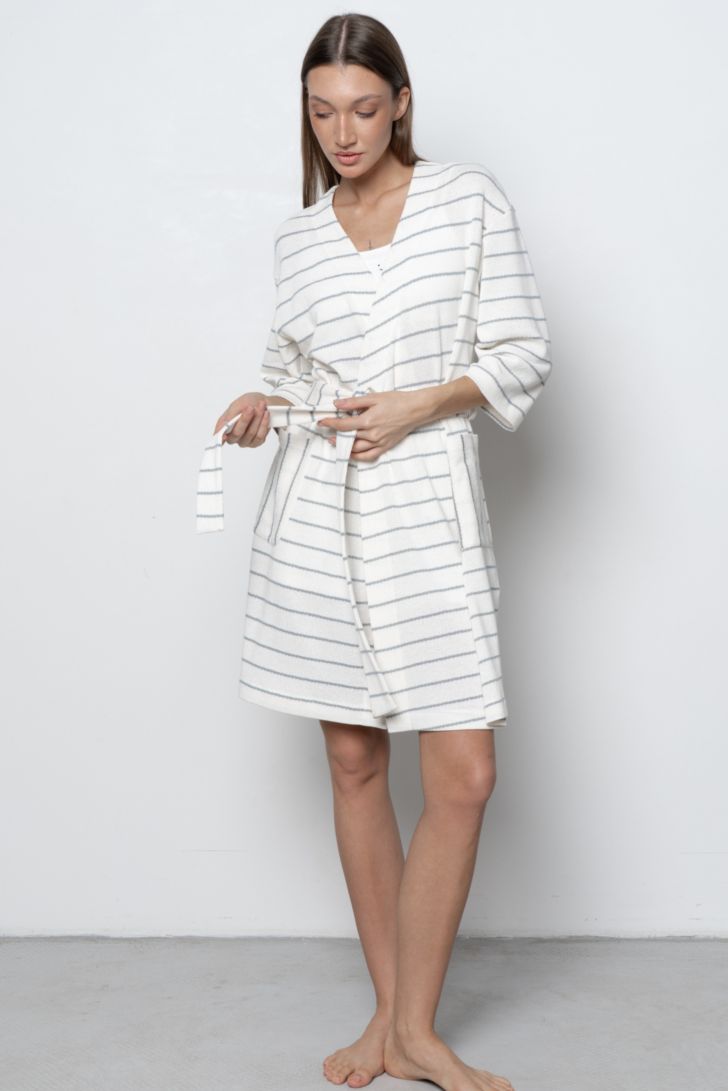 Халат на запахе со спущенной линией плеча. Рукав 7/8 удобен в носке. Длина выше колена. Модель декорирована накладными карманами с открытыми срезами. В составе полотна полиэстер. Это значит, что изделие прослужит вам дольше и за ним легко ухаживать."