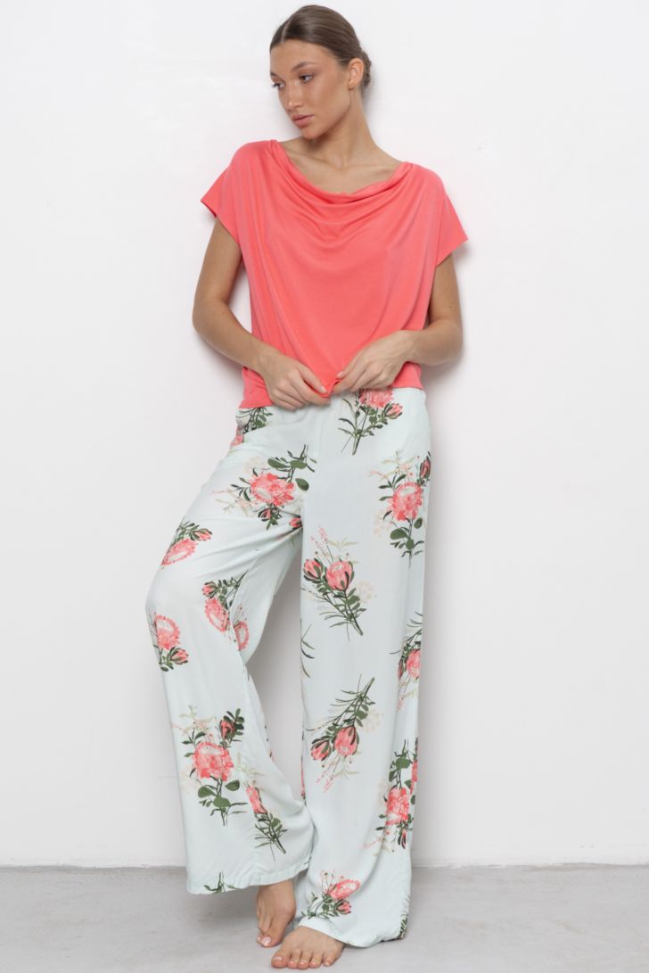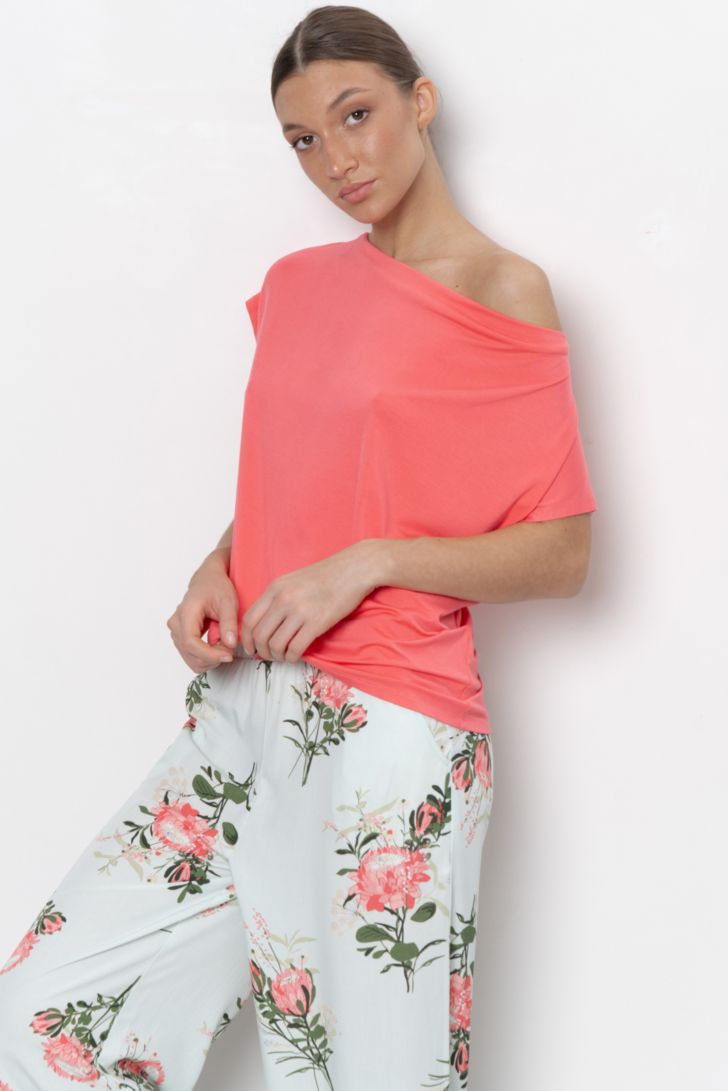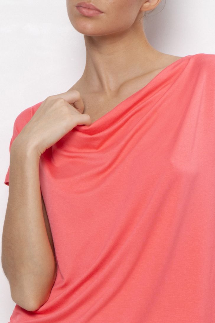 Футболка со спущенным рукавом, с естественно драпирующимся вырезом «лодочка». Модель свободного прилегания. Представлена в двух цветовых решениях. К данной модели предлагаем брюки и шорты из вискозного штапеля. "