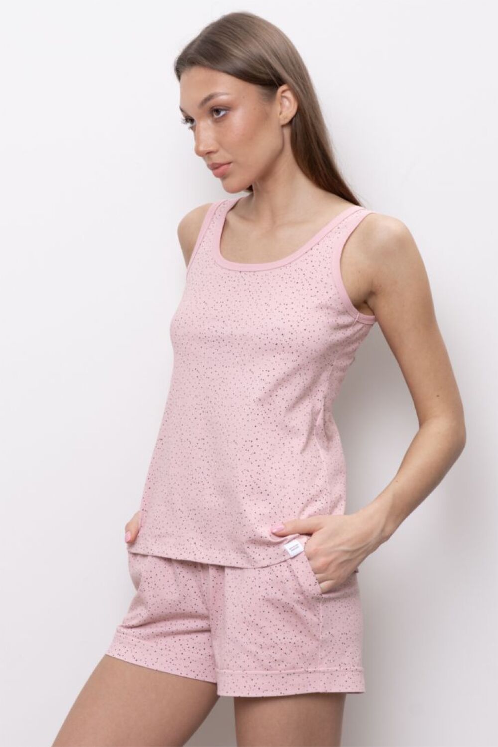 Майка свободного прилегания на широкой бретели. Вырез горловины круглый. Горловина и пройма обработаны мягкой обтачкой из кашкорсе. Майка дополнит образ к любым брюкам и шортам. Модель представлена в трех цветовых решениях."