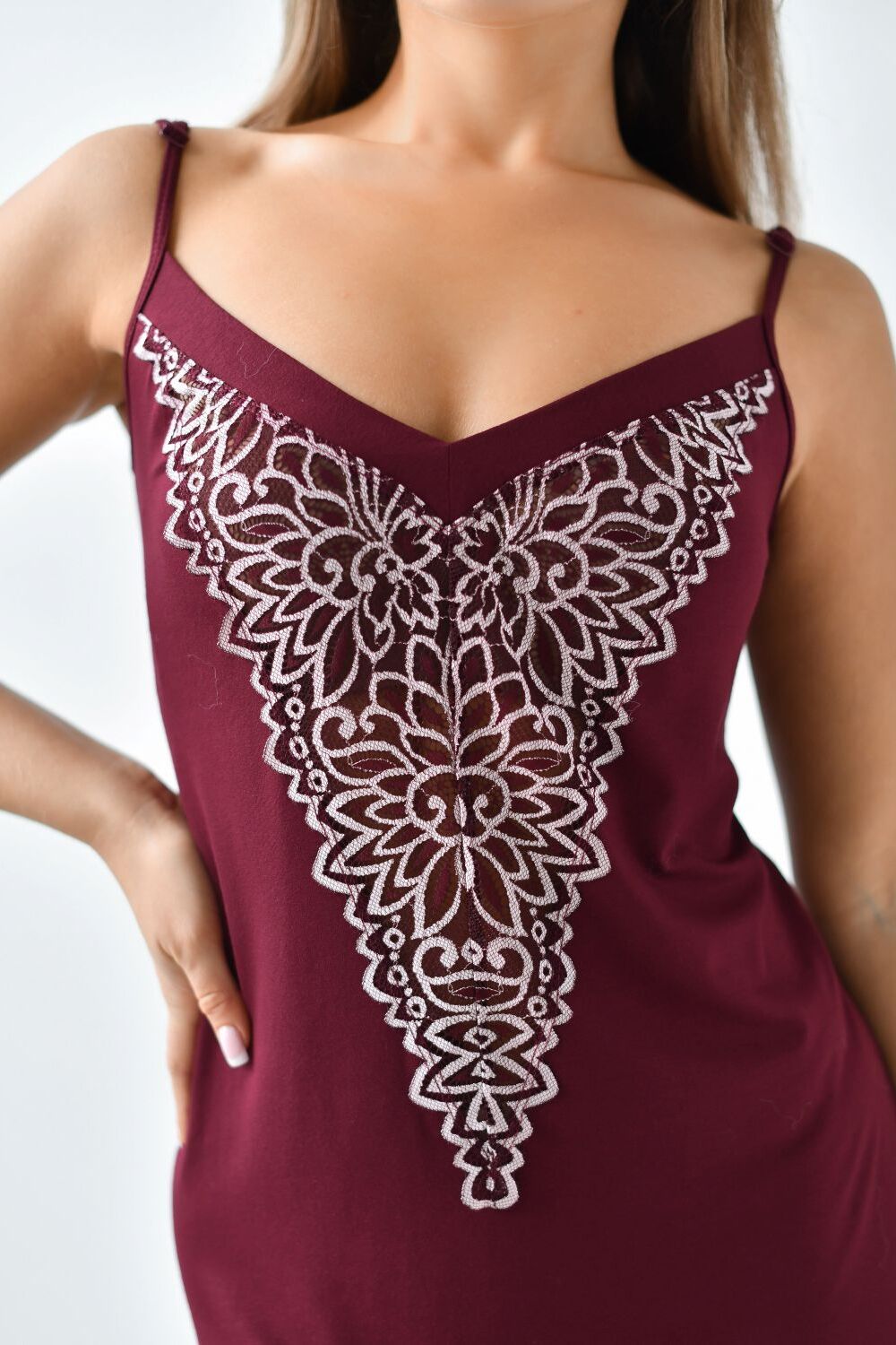 Ночная сорочка женская Сара из натурального трикотажного полотна (вискоза 92% и эластан 8%) от российского текстильного бренда Batistcorp Ivanovo (Батист). Имеет округлый вырез горловины. Сорочка без рукавов, на узких, регулируемых бретелях длиной выше колена и полуприлегающим покроем. Скроет недостатки и покажет достоинства фигуры. На спине аккуратно прилегает к телу. Садится свободно, не жмет и не давит. Низ сорочки, зона декольте и перед окаймлены ажурным эластичным кружевом. Кружева мягкие, приятные к телу. Белье изготовлено из вискозной гипоаллергенной ткани. Она хорошо дышит и лучше впитывает влагу, струится и имеет более равномерную окраску. Красивая и молодежная, модная и стильная ночнушка для сна и отдыха. Подойдут на любой рост: для высоких, для невысоких и дам среднего роста. Подходящий вариант для каждого возраста: для молодых девушек и женщин чуть постарше. Однотонные расцветки понравятся подростку и молодежи. Впереди праздники 14 февраля и 8 марта, приобретайте себе или близким. Скоро весна время обновлений! Обращаем Ваше внимание! При стирке изделий из вискозы, необходимо сложить изделие в специальный мешочек из сетки, выбрать Деликатный режим. Оптимально, если есть Ручная стирка. Температура стирки не выше 30 градусов. Интенсивное воздействие должно быть исключено. Поэтому Отжим следует отключить. В противном случае, вещь может серьезно пострадать. Стирать вещи из вискозы вместе с изделиями из грубой ткани не допустимо. Гладить можно только с изнаночной стороны. Покупайте только красивые вещи, и пусть Ваше настроение всегда будет отличным! Цвет: бордо; Материал: вискоза;вискоза; Состав: 92% вискоза, 8% эластан.