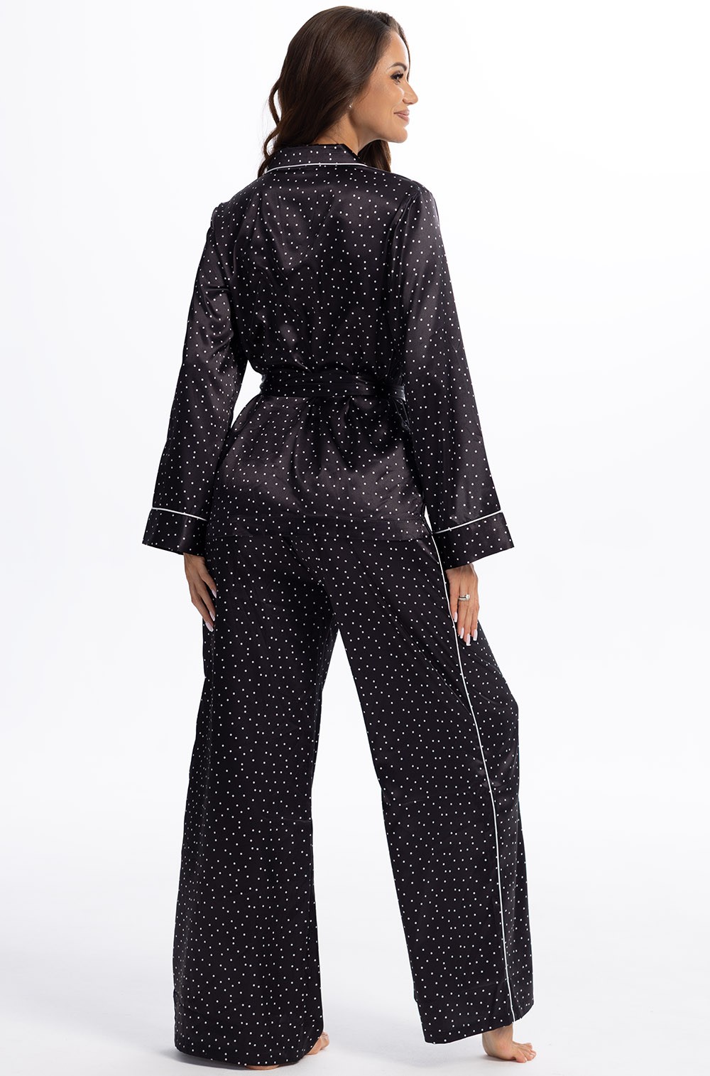 Комплект Mia-Amore состоит из брюк и жакета на пуговицах, выполнен из искусственного шёлка с принтом в виде мелкого горошка. Брюки с эластичным поясом и боковыми карманами. Жакет с английским воротником и центральной застёжкой на пуговицы, с длинными рукавами. Жакет и брюки сбоку декорированы тонким контрастным кантом. По талии жакет можно приталить с помощью съёмного пояса.