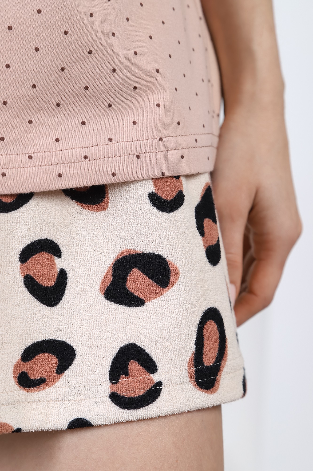 Пижама из трикотажного полотна «кулирка» в комбинации с трикотажным полотном «махра» с набивным рисунком в единой цветовой гамме, состоящая из футболки и шорт. Футболка – из гладкокрашеного полотна «кулирка», классического покроя, с короткими цельнокроеными рукавами, горловиной v- образной формы, окантованной основным материалом. На полочке принт, выполненный в технике «шелкографии».Шорты – из полотна «махра», средней длины, расширенные книзу с эластичной тесьмой по талии.