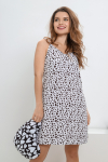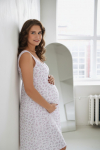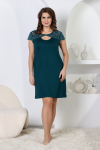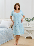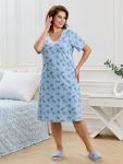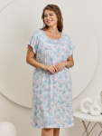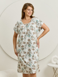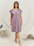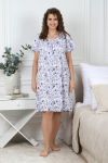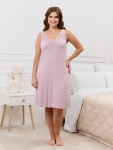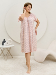 Сорочка женская из трикотажного полотна «кулирка» с набивным рисунком, без рукавов, расширенная книзу, на притачных бретелях с отделкой из кружева. Горловина и проймы окантованы основным материалом, перед присборен в центре горловины. По шву притачивания правой бретели прикреплен декоративный бантик из узкой атласной ленты.