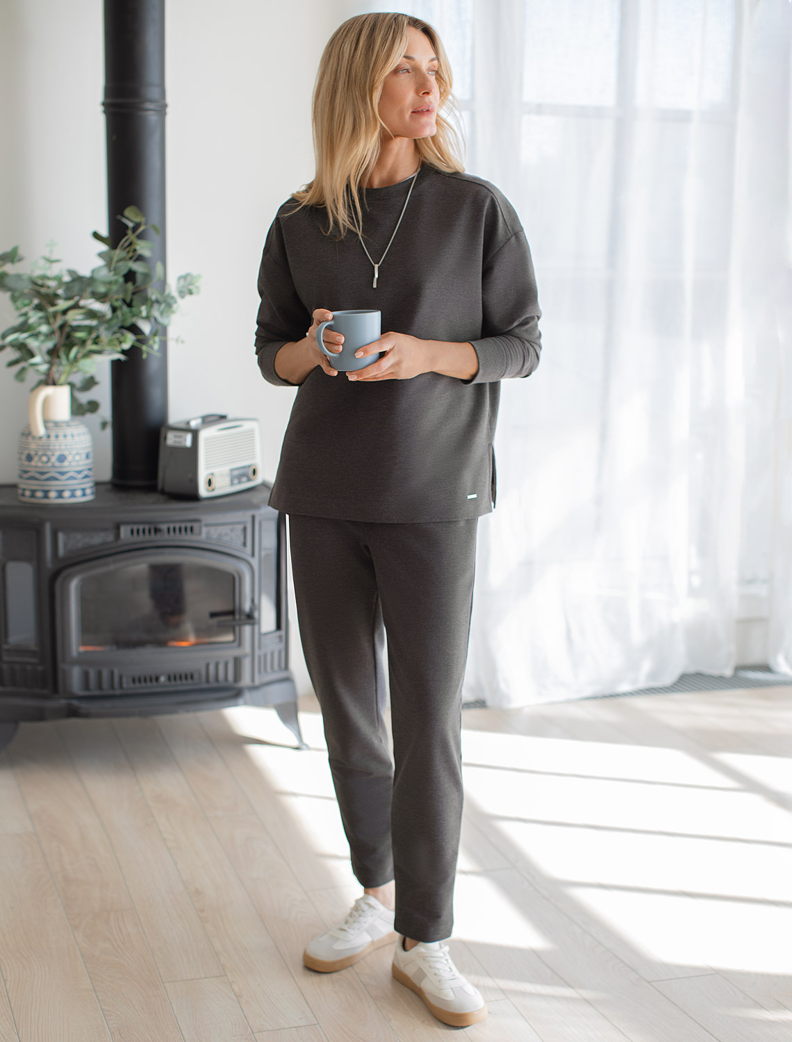Брюки выполнены из тонкого хлопкового футера. Эластичный материал хорошо пропускает воздух, позволяя телу дышать, и легко тянется, не ограничивая движения. Пояс на резинке дополнен внутренним шнуром, для комфортной регулировки изделия. Брюки сочетаются в костюме с джемпером D49.054 и D49.055