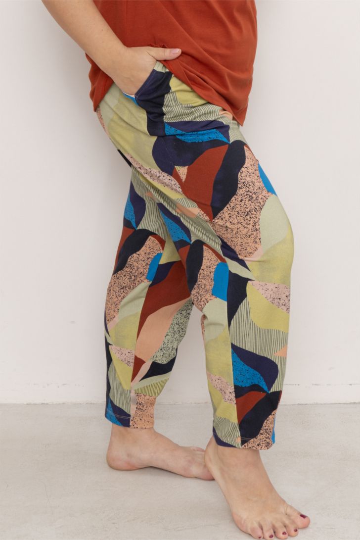 Брюки свободного прилегания, зауженные к низу. По низу изделия защип. В боковых швах функциональные карманы. Пояс на мягкой комфортной резинке. Образ с брюками может быть дополнен платьем - халатом.