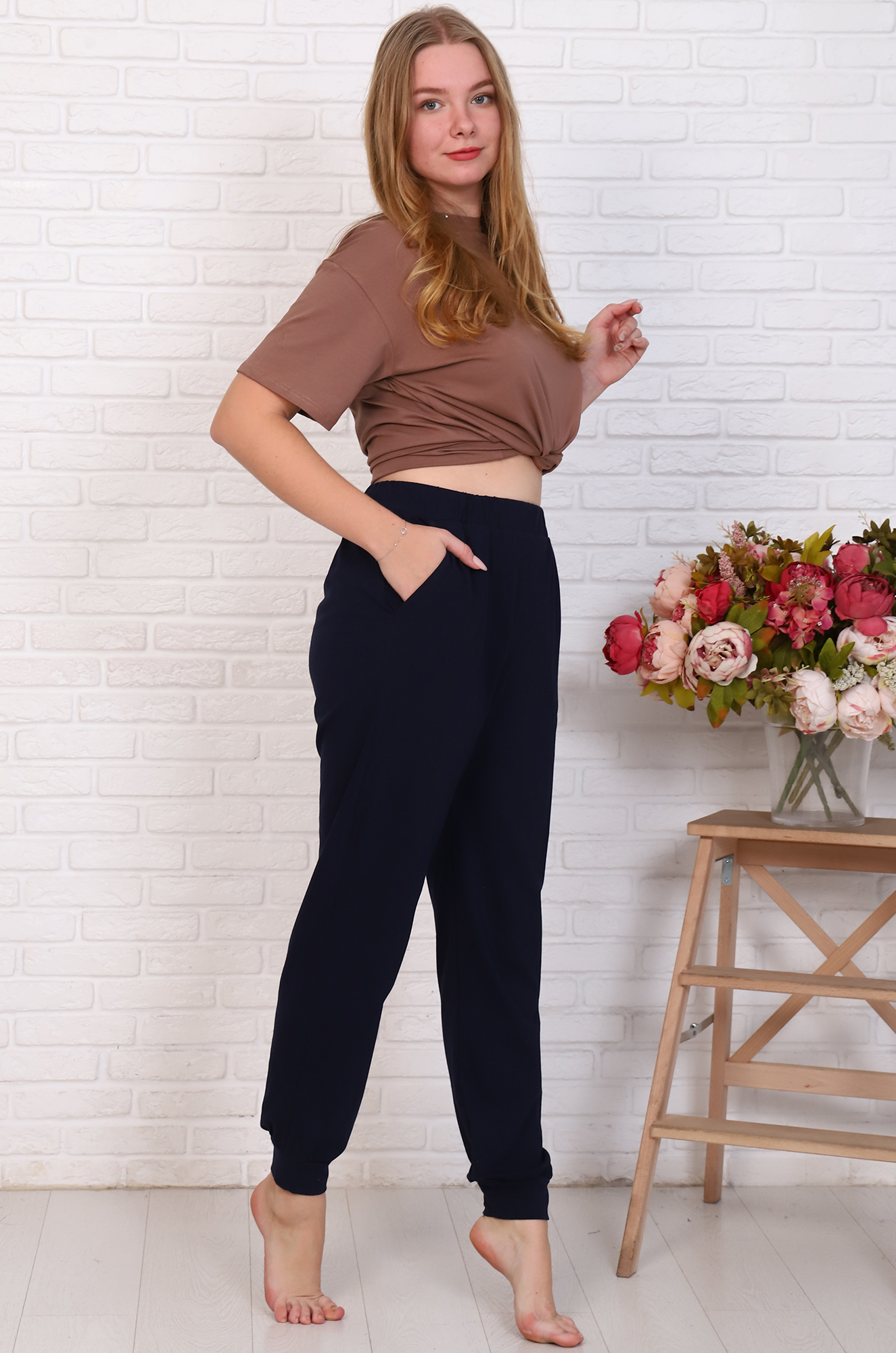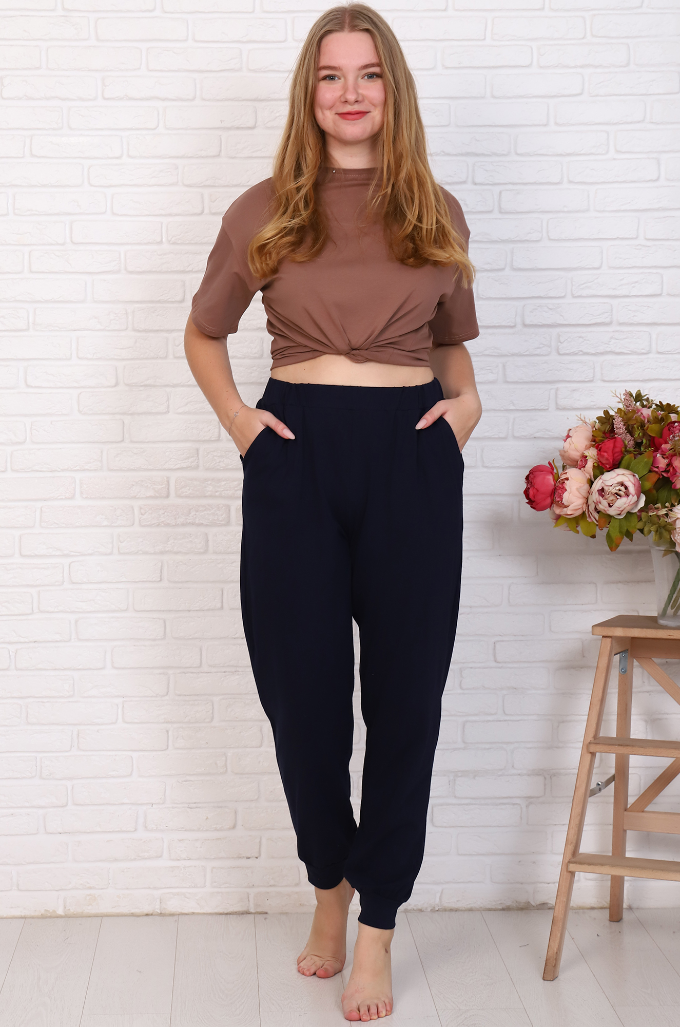 Однотонные хлопковые брючки с боковыми карманами, снизу на манжете, пояс на широкой резинке. Брюки комфортной посадки, отлично сидят на любой фигуре.