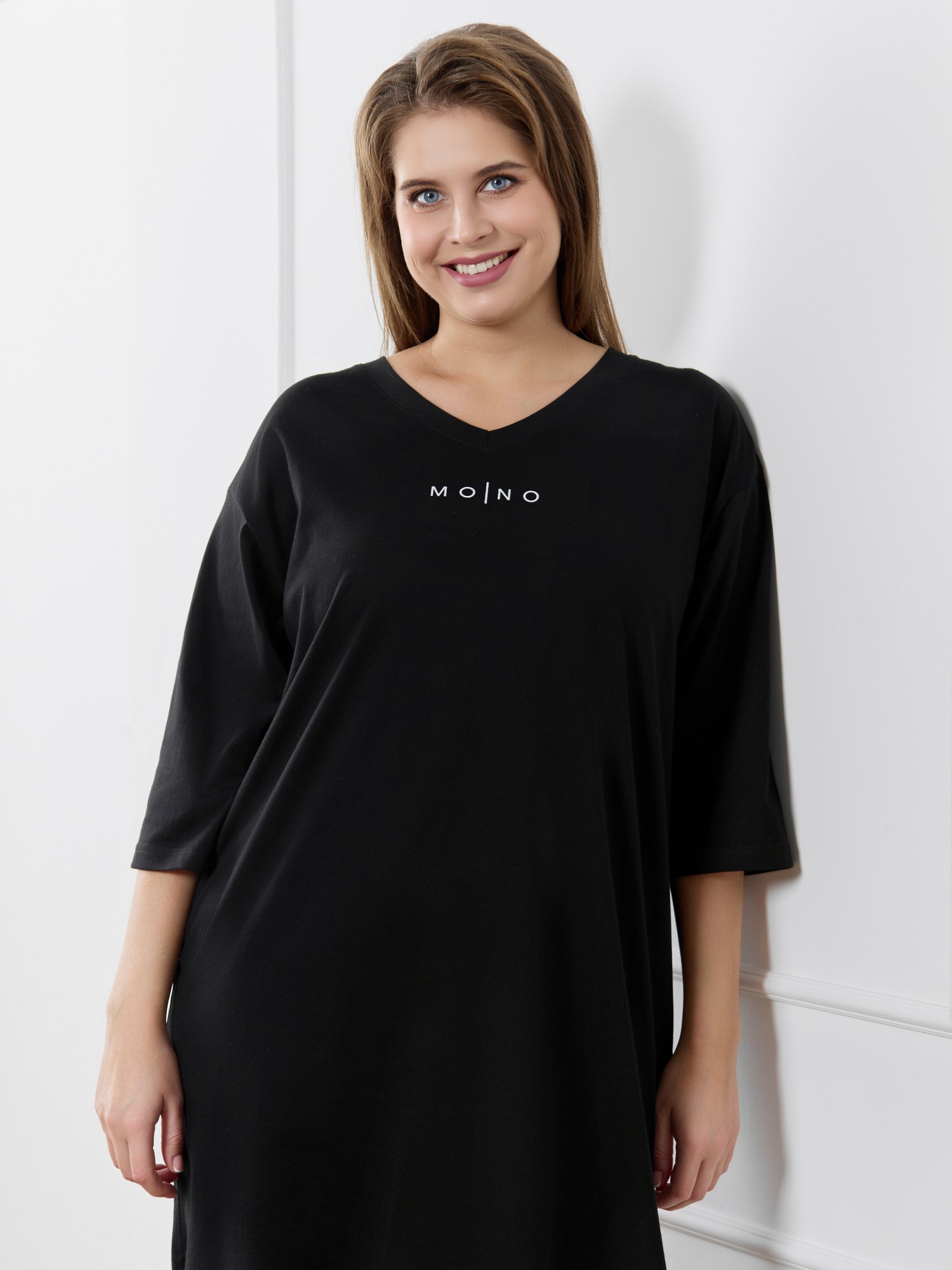 Туника женская из гладкокрашенного полотна «кулирка», свободного кроя, со спущенной линией плеча, втачными рукавами длиной до локтя, горловиной V-образной формы обработанной втачной планкой и принтом на полочке выполненным в технике «шелкографии». Модным элементом является разность длин фигурного низа изделия: низ полочки – прямой укороченный, низ спинки – удлиненный скруглённой формы.