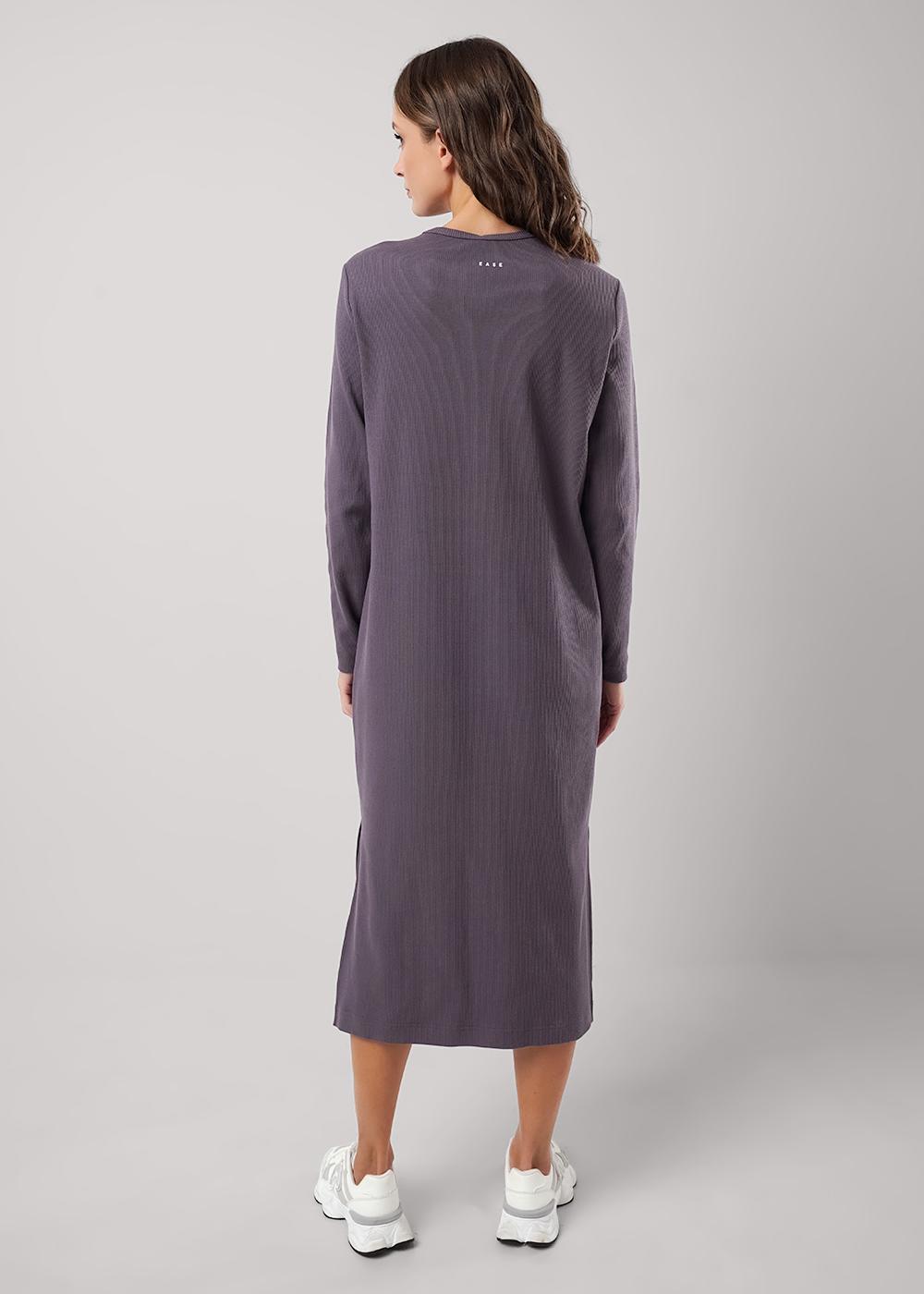 Платье из трикотажного эластичного полотна кашкорсе. Прямого силуэта длиной миди,по бокам разрезы. Округлая горловина с окантовкой. Длинный втачной рукав, внизу нашивка. На спинке принт.