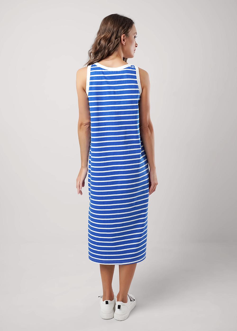 Платье для дома и отдыха прямого силуэта из хлопкового трикотажного полотна, без рукавов среднее плечо. По горловине и пройме окантовка. Спереди принт вспенка, боковые разрезы.