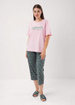 Платье для дома и отдыха из хлопкового трикотажного полотна,прямого силуэта. Втачной короткий рукав, внизу термонаклейка силикон. Округлая горловина с обтачкой. По низу изделия отрезная юбка, собрана на сборку. Спереди принт,вышивка.
