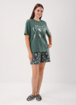 Платье для дома и отдыха прямого силуэта из трикотажного полотна. Короткий рукав реглан. По горловине обтачка с застилом. По спинке средний шов с застилом. По низу рукаву и изделия подгибка с застилом. Боковой разрез. Спереди и на спинке принт.