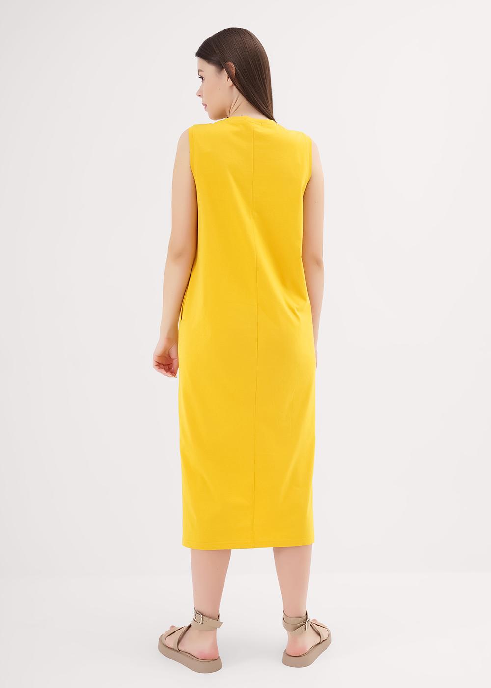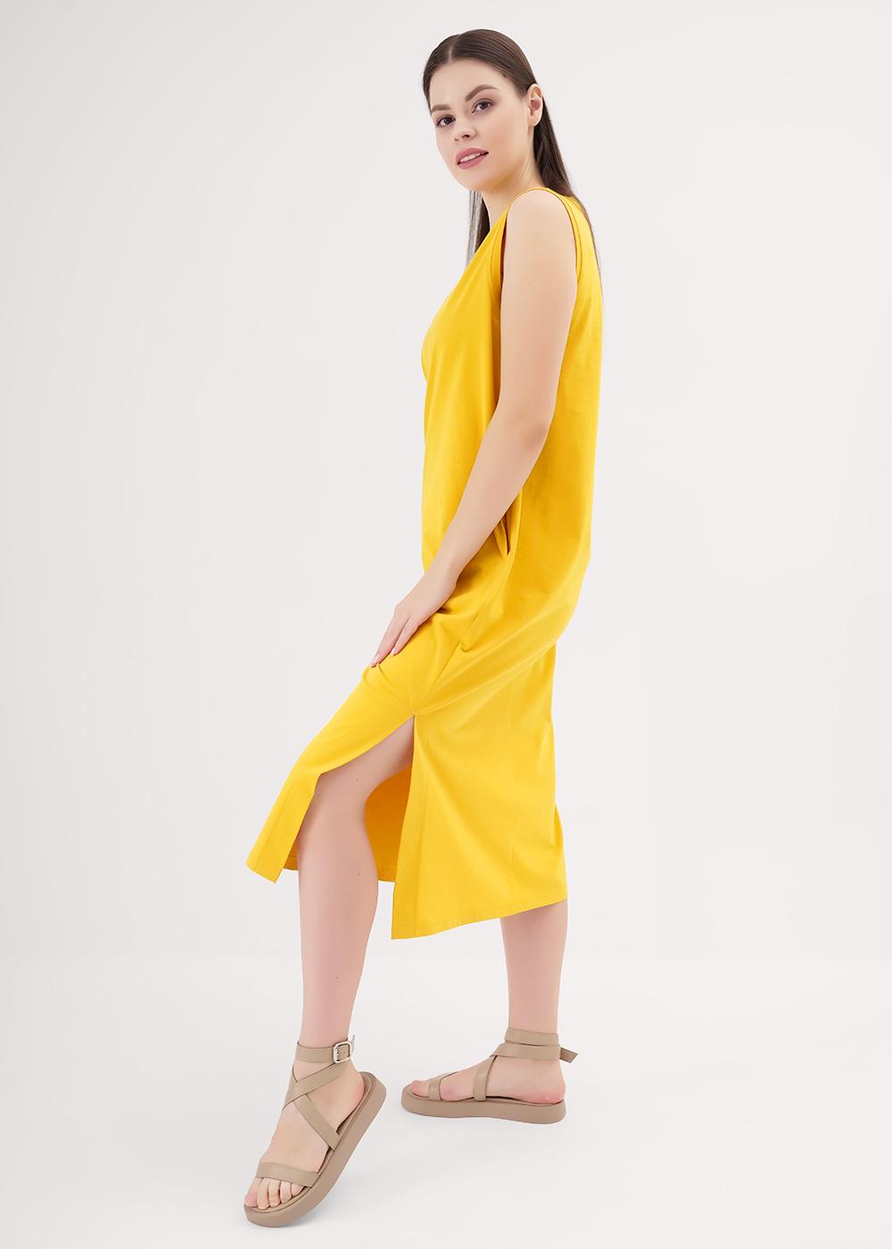Платье без рукавов для дома и отдыха из хлопкового трикотажного полотна, прямого силуэта. По горловине и пройме обтачки. Карманы в боковом шве, боковые разрезы. Сзади средний шов. Спереди принт вспенка с вышивкой.