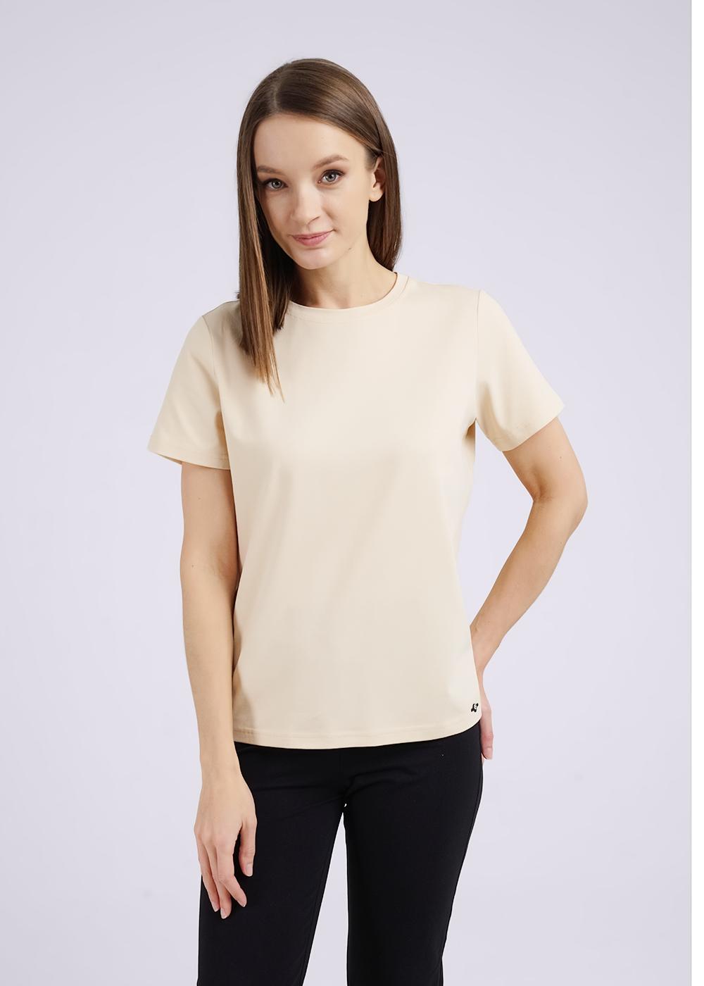 Футболка женская из эластичного хлопкового полотна. Классический прямой крой. Округлая горловина с обтачкой. Короткий рукав. На левом рукаве фирменная силиконовая нашивка.