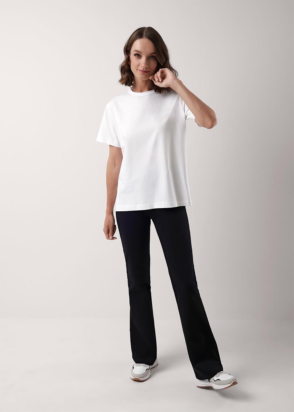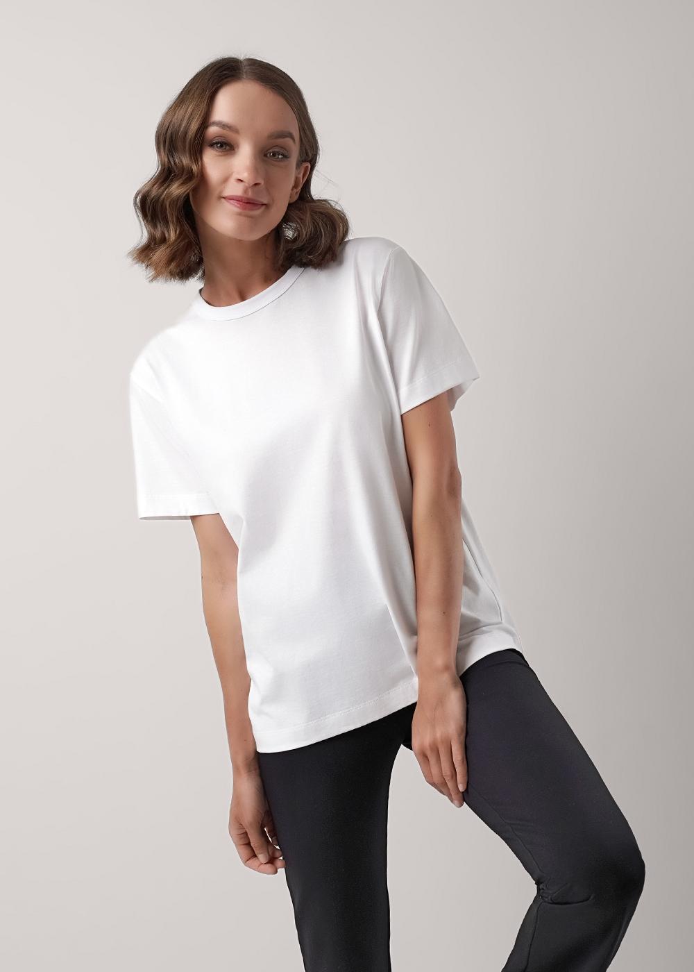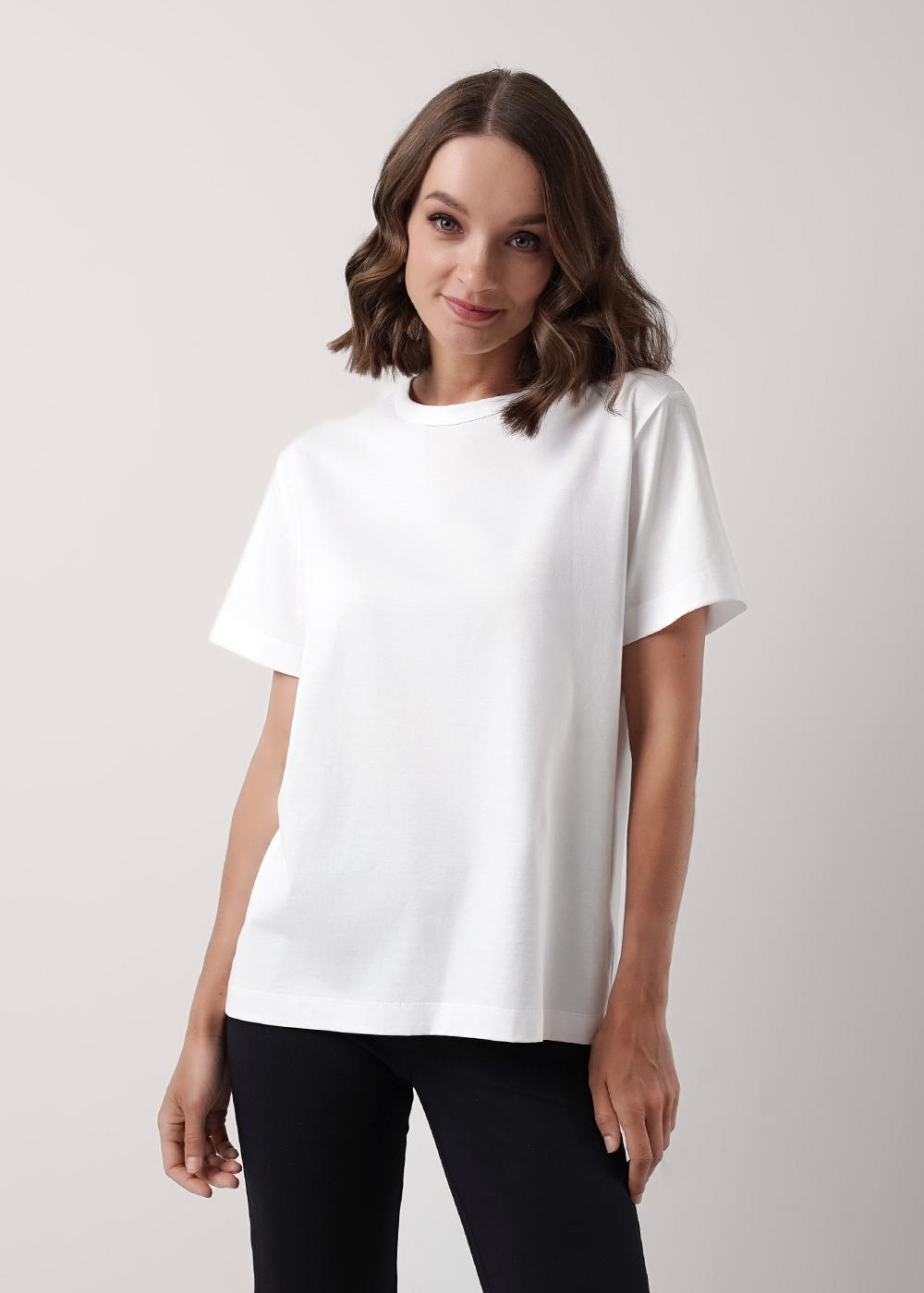 Футболка женская из трикотажного хлопкового полотна. Классический прямой крой. Округлая горловина с окантовкой. Короткий втачной рукав.