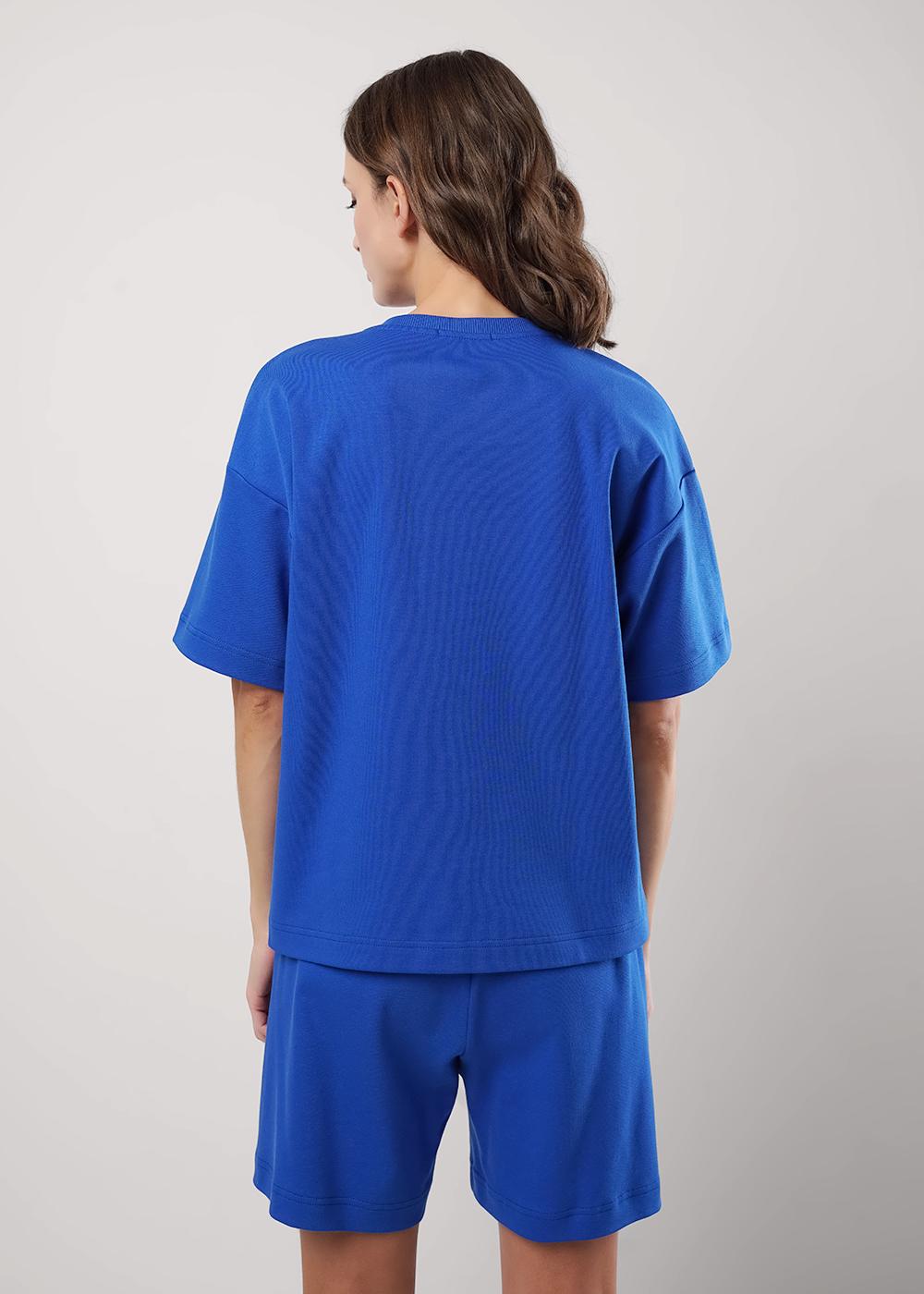 Футболка для дома и отдыха прямого силуэта из хлопкового трикотажного полотна интерлок. Округлая горловина с обтачкой из кашкорсе. Короткий рукав со спущенной линией плеча. На детали переда принт, нашивка.