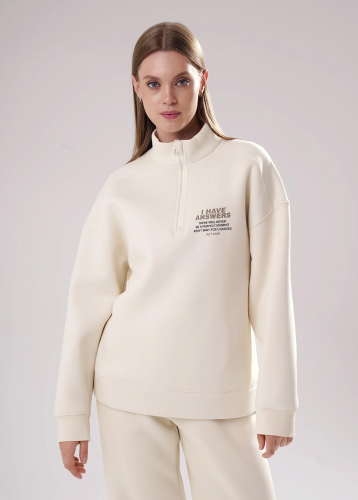 Джемпер спортивный из трикотажного полотна футер с начесом, свободного кроя. Длинный рукав со спущенной линией плеча. По горловине стойка с застежкой на молнию. По спинке кокетка. По низу рукава и изделия манжет. Спереди принт.
