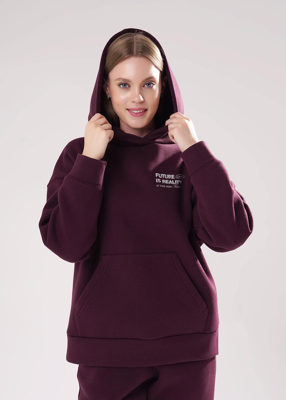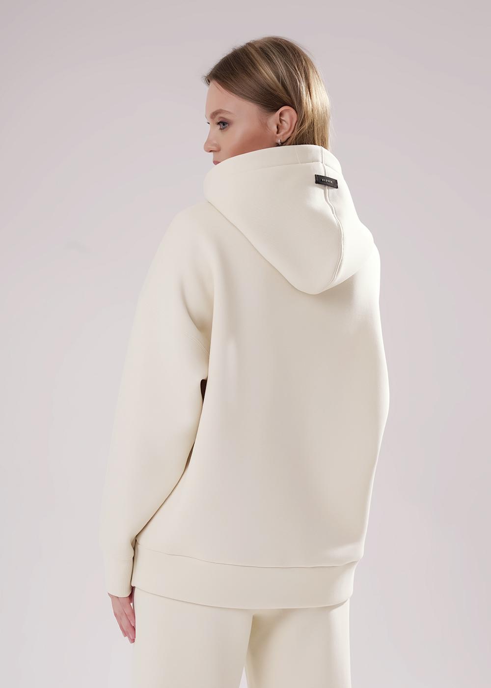 "Описание: Джемпер спортивный свободного силуэта из трикотажного полотна футер с начесом, с капюшоном на подкладе. Длинный рукав со спущенной линией плеча. По низу рукава и изделия манжеты. Спереди вверху принт, внизу карман кенгуру.