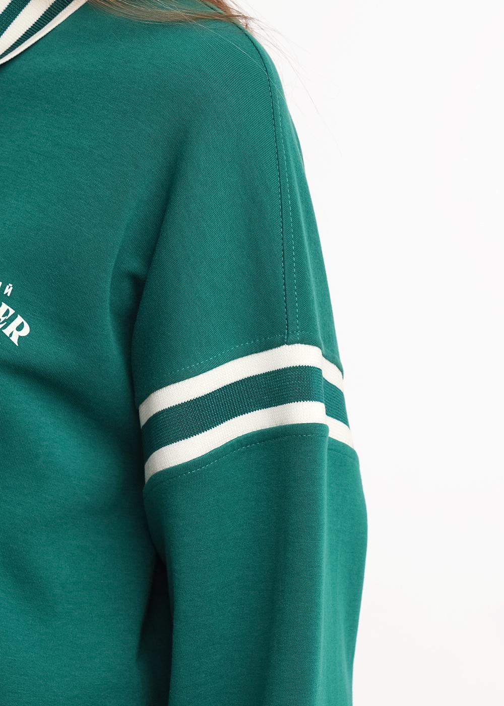 Джемпер из трикотажного полотна дабл фейс. Длинный рукав со спущенной линией плеча. По горловине вязаный воротник с планкой на кнопки. По окату рукава вязаная отделка. По низу рукава манжет из кашкорсе,по низу изделия из основного полотна. Спереди принт.