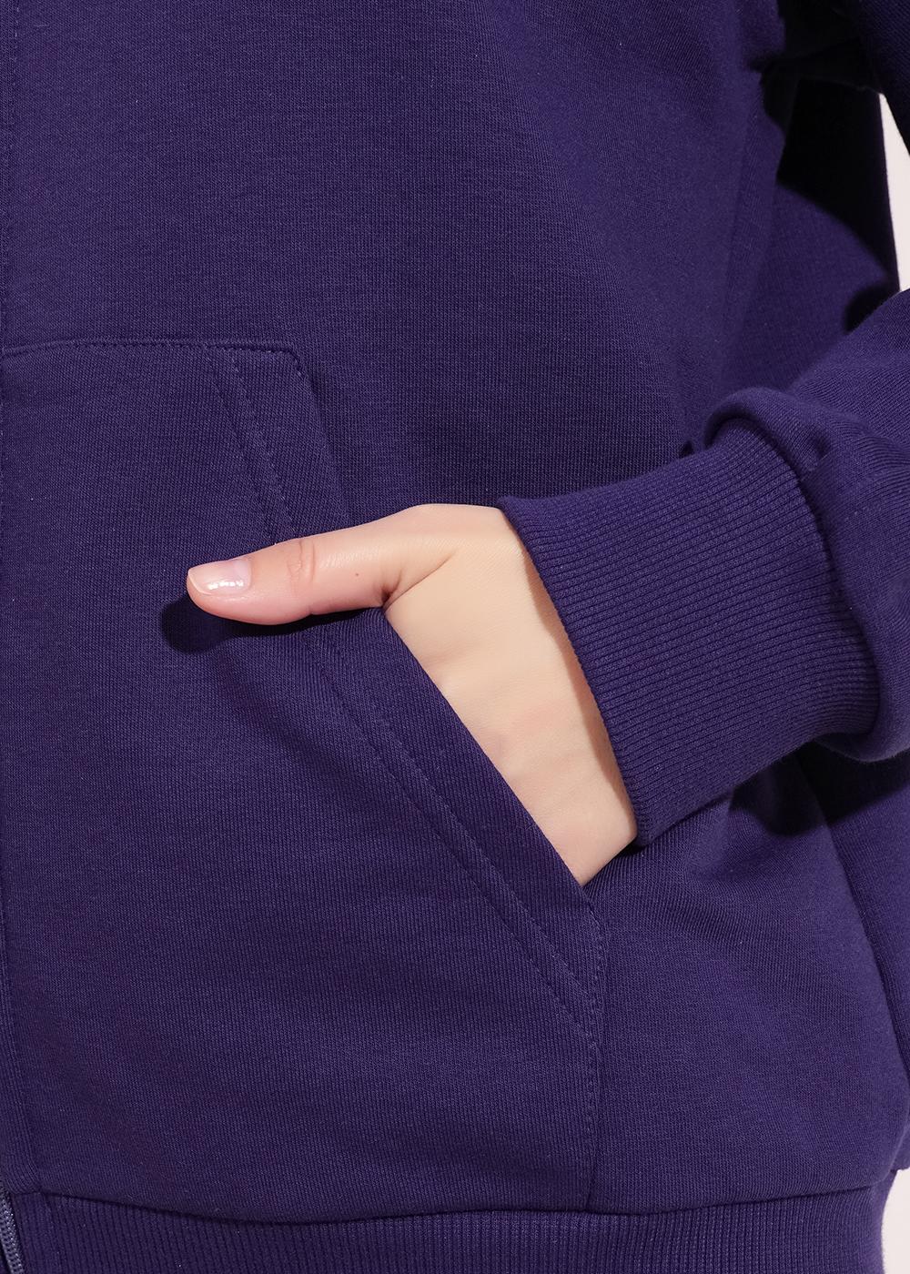 Куртка спортивная из трикотажного полотна футер,на молнии. По горловине капюшон на подкладе со шнуром. Длинный рукав со спущенной линией плеча, нашивка.По низу рукава и изделия манжеты. Спереди карман кенгуру, принт.По пройме и шву рукава открытый срез.