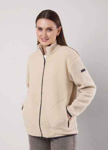Куртка спортивная прямого силуэта из трикотажного полотна флис. По горловине отложной воротник, по борту застежка на пуговицы. Спереди накладные карманы, нашивка. Длинный рукав, внизу на манжете. Фигурный низ изделия с боковыми вставками.