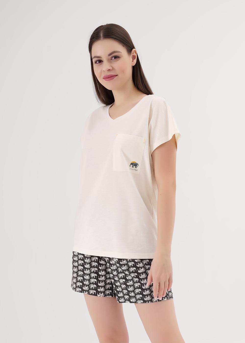 Набор одежды для дома и отдыха из трикотажного полотна. Футболка прямого кроя, горловина с обтачкой. Короткий целькроенный рукав. Спереди накладной карман с принтом вспенка. Шорты с поясом на резинке и киперной лентой. Боковые карманы с отрезным бочком.
