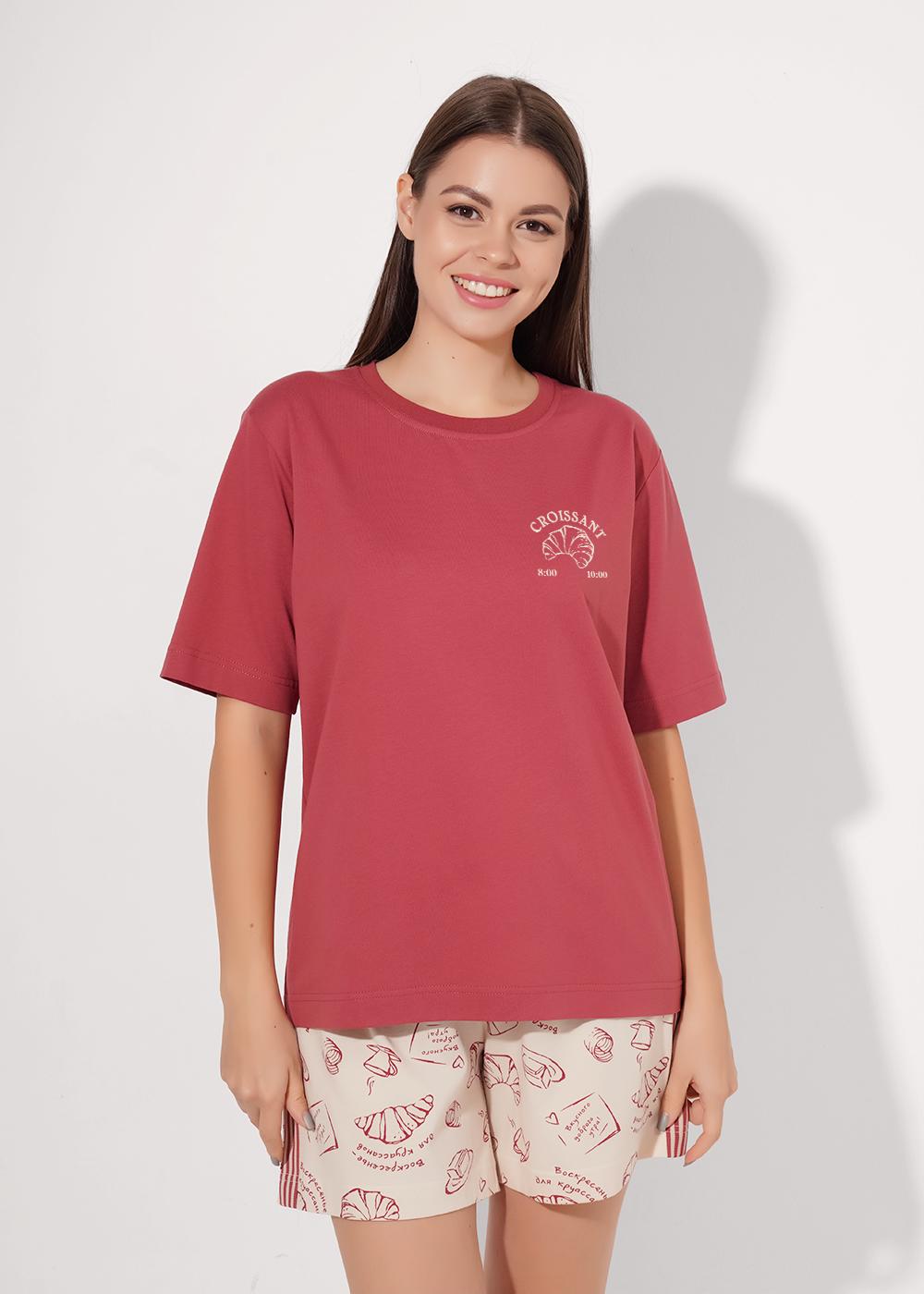 Набор одежды из хлопкового трикотажного полотна. Футболка прямого кроя. Короткий втачной рукав. Округлая горловина с обтачкой. Спереди и по спинке принт. Шорты с поясом на внутренней резинке. По боковому шву -лампас из тесьмы, спереди нашивка.