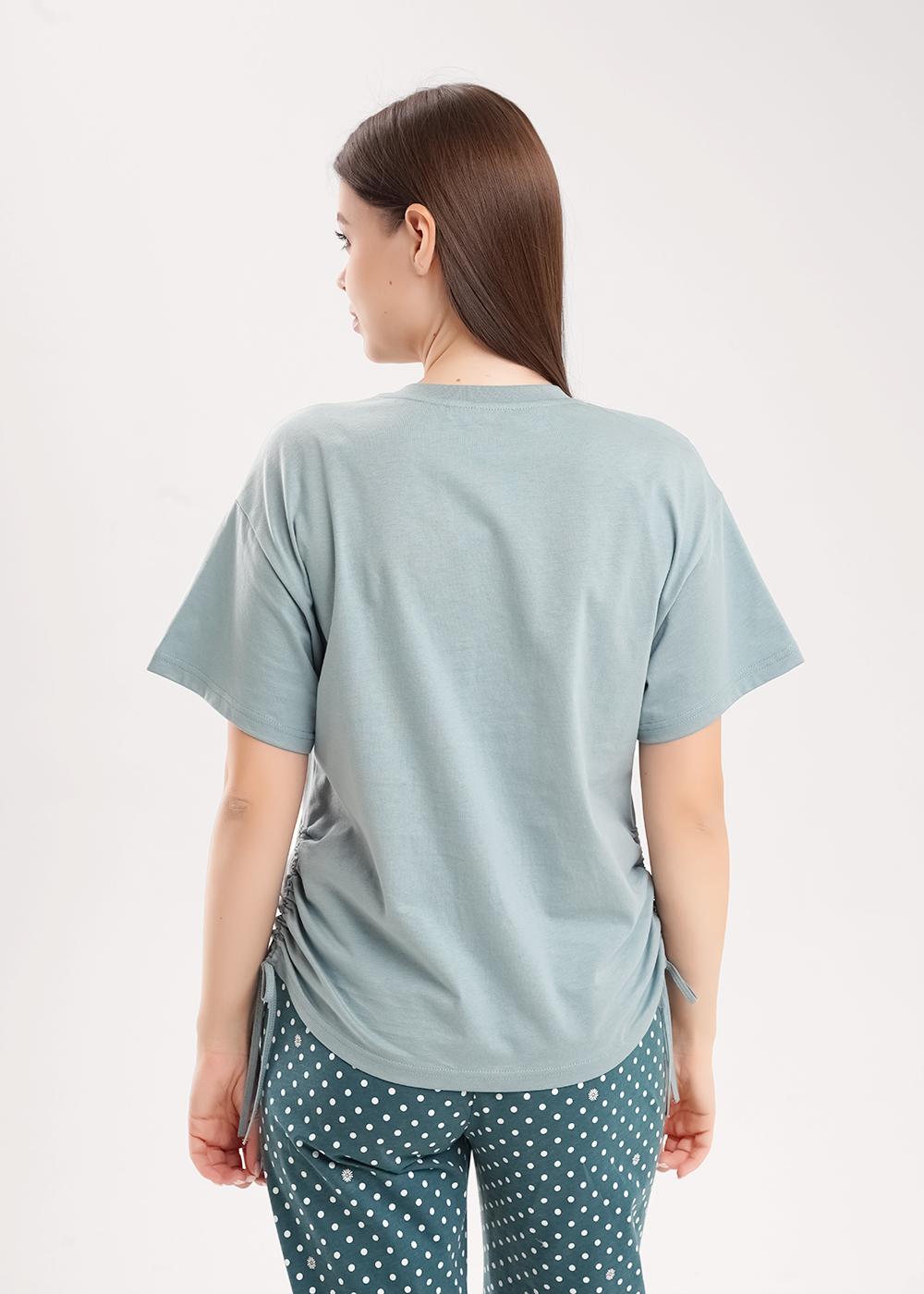 Набор одежды из трикотажного полотна.Футболка прямого кроя, короткий втачной рукав,вышивка.Горловина с обтачкой. Спереди принт,по бокам кулиса с завязками из окантовки.Брюки с поясом на внутренней резинке.Боковые карманы с отрезным бочком,по низу резинка