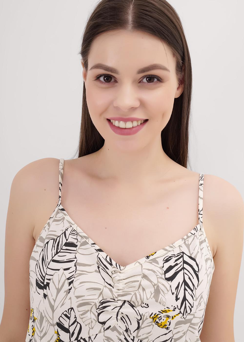 Ночная сорочка из хлопкового трикотажного полотна. А-образного силуэта на бретелях. По горловине и пройме окантовка. По лифу рез, по центру со сборкой на резинку. По низу изделия волан.