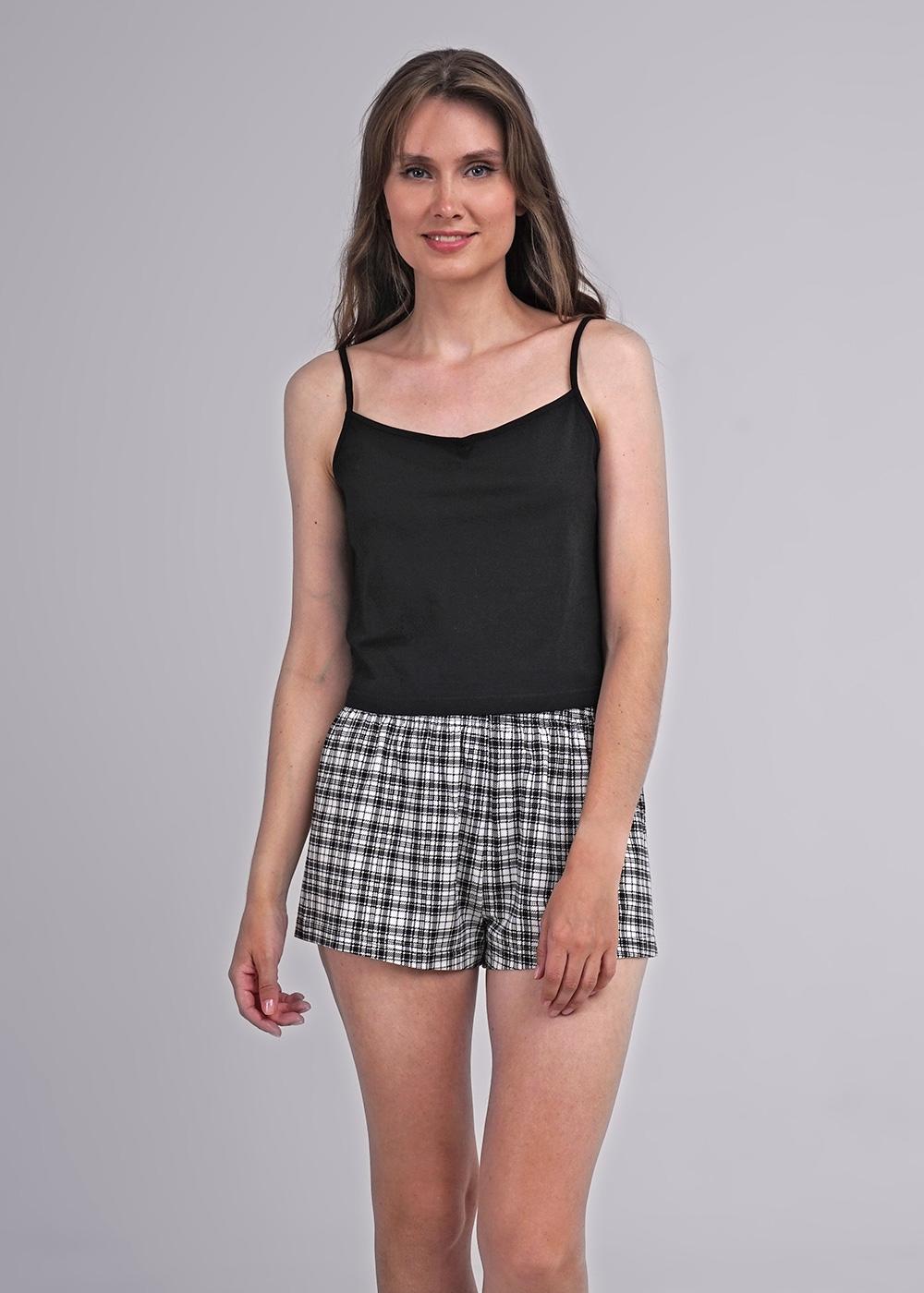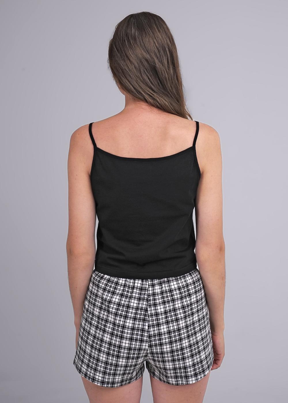 Пижама для дома из хлопкового трикотажного полотна. Майка прямого силуэта, на узких бретелях. По горловине и пройме окантовка. Короткие шорты свободного кроя, цельнокроеный пояс на внутренней резинке.