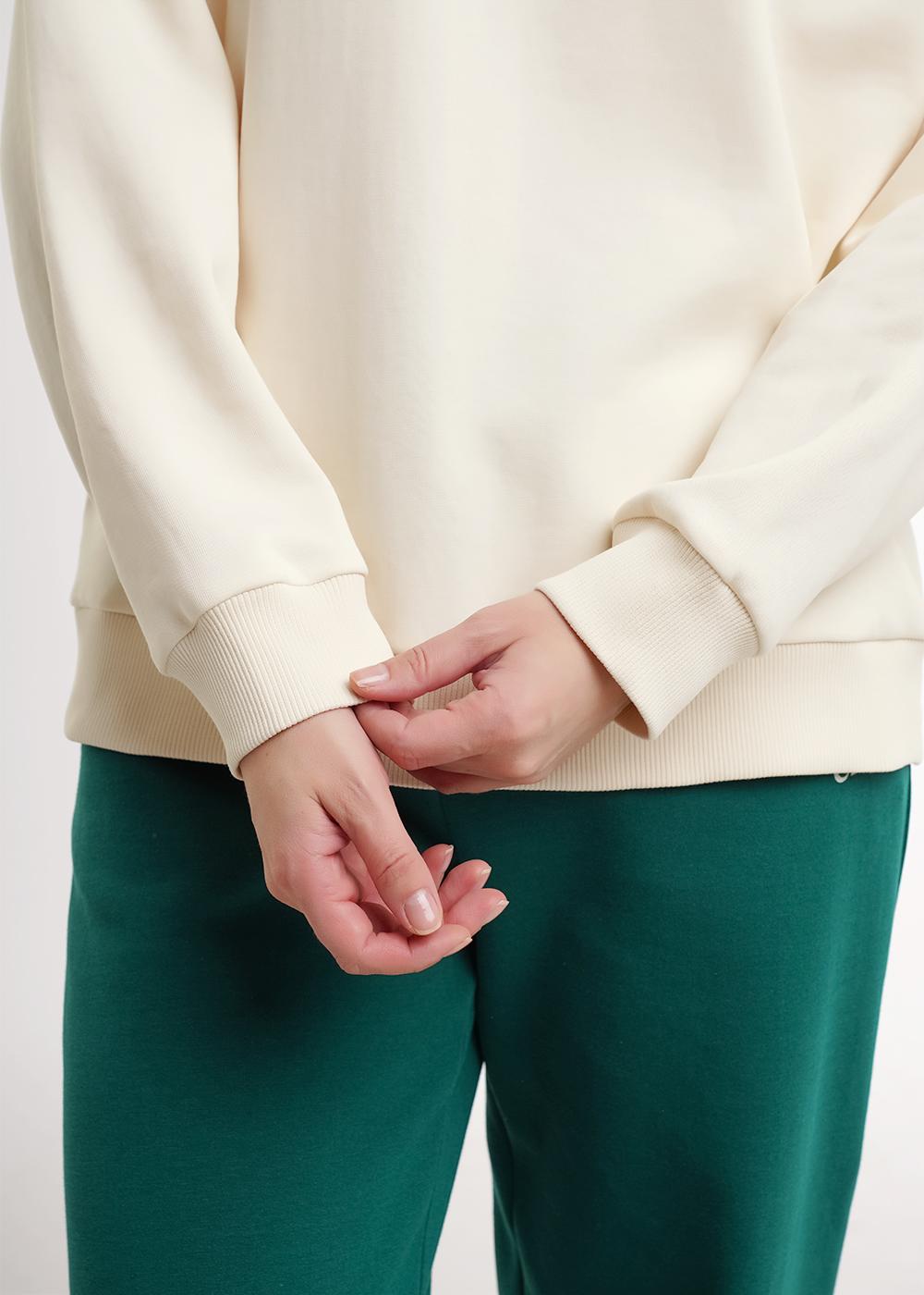 Джемпер из трикотажного полотна дабл фейс свободного силуэта. Длинный рукав со спущенной линией плеча. Округлая горловина с обтачкой из кашкорсе. По низу рукава и изделия манжет из кашкорсе. Спереди принт.